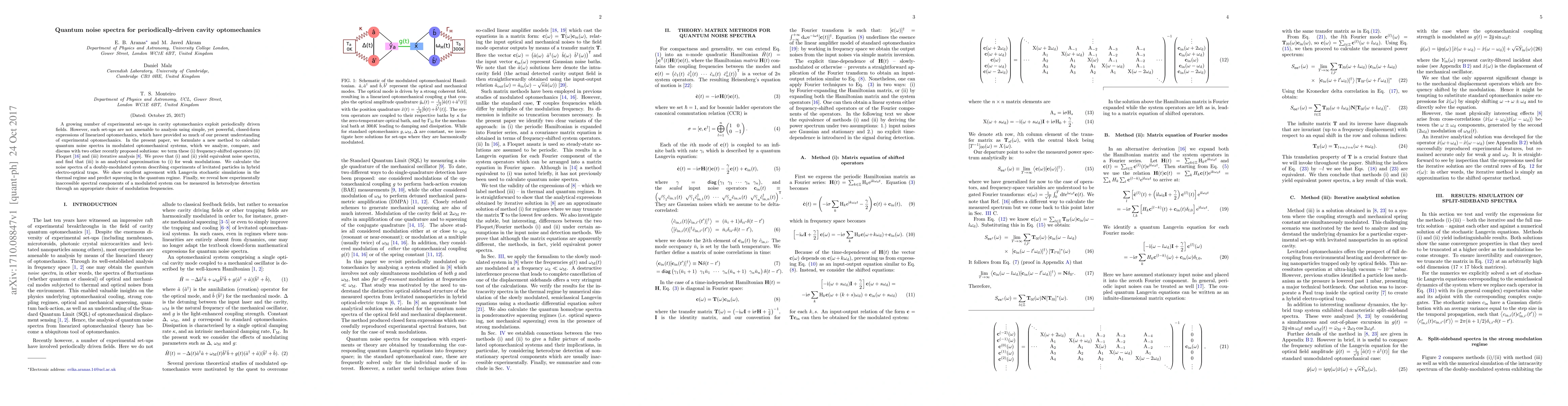 A growing number of experimental set-ups in cavity optomechanics exploit periodically driven fields. However, such set-ups are not amenable to analysis using simple, yet powerful, closed-form expressions of linearized optomechanics, which have provided so much of our present understanding of experimental optomechanics. In the present paper, we formulate a new method to calculate quantum noise spectra in modulated optomechanical systems, which we analyze, compare, and discuss with two other recently proposed solutions: we term these (i) frequency-shifted operators (ii) Floquet and (iii) iterative analysis. We prove that (i) and (ii) yield equivalent noise spectra, and find that (iii) is an analytical approximation to (i) for weak modulations. We calculate the noise spectra of a doubly-modulated system describing experiments of levitated particles in hybrid electro-optical traps. We show excellent agreement with Langevin stochastic simulations in the thermal regime and predict squeezing in the quantum regime. Finally, we reveal how experimentally inaccessible spectral components of a modulated system can be measured in heterodyne detection through an appropriate choice of modulation frequencies.