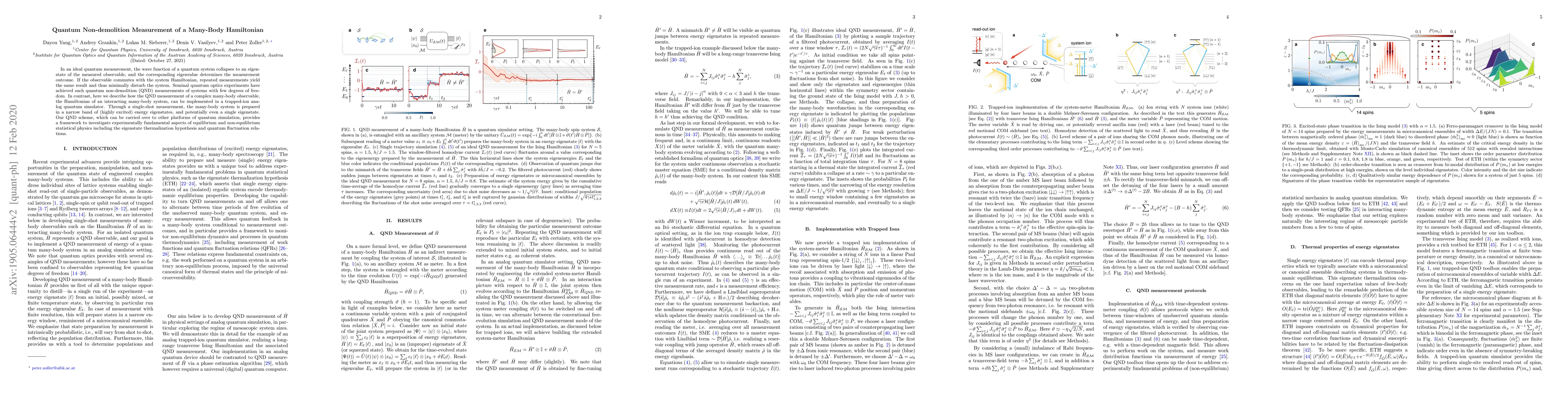 This paper details a quantum non-demolition (QND) measurement technique for a many-body Hamiltonian in a trapped-ion quantum simulator, enabling precise, repeated measurements that minimally disturb the system. The method allows single-shot preparation of a complex many-body system in a narrow band of highly excited energy eigenstates, facilitating investigation of statistical physics phenomena.