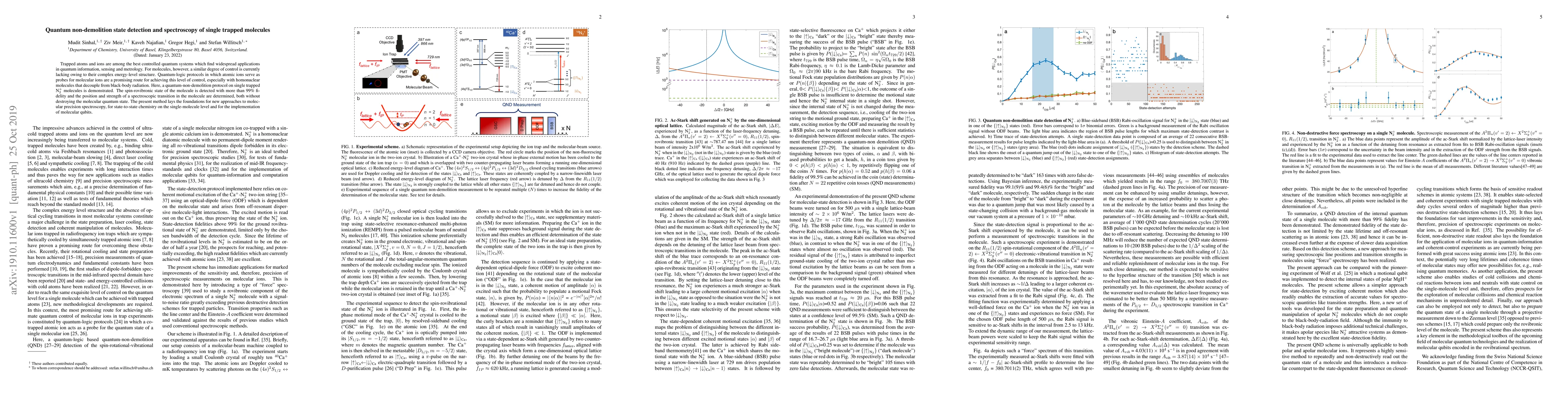 Trapped atoms and ions are among the best controlled quantum systems which find widespread applications in quantum information, sensing and metrology. For molecules, however, a similar degree of control is currently lacking owing to their complex energy-level structure. Quantum-logic protocols in which atomic ions serve as probes for molecular ions are a promising route for achieving this level of control, especially with homonuclear molecules that decouple from black-body radiation. Here, a quantum-non-demolition protocol on single trapped N$_2^+$ molecules is demonstrated. The spin-rovibronic state of the molecule is detected with more than 99% fidelity and the position and strength of a spectroscopic transition in the molecule are determined, both without destroying the molecular quantum state. The present method lays the foundations for new approaches to molecular precision spectroscopy, for state-to-state chemistry on the single-molecule level and for the implementation of molecular qubits.