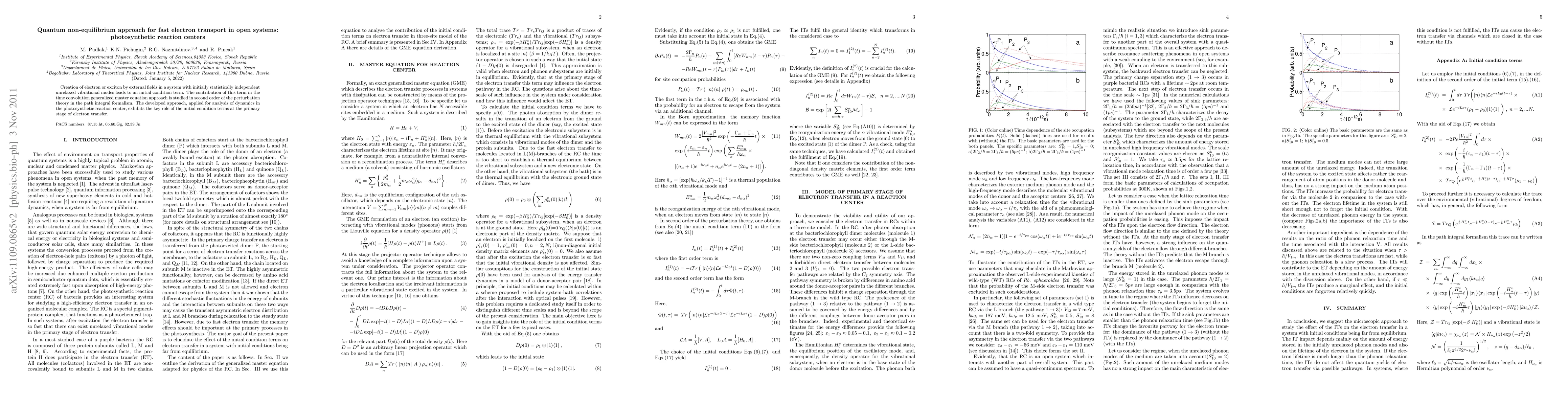 This research introduces a quantum non-equilibrium approach to analyze fast electron transport in open systems, focusing on photosynthetic reaction centers. The method, studied through perturbation theory in path integral formalism, highlights the crucial role of initial condition terms in the early stages of electron transfer.