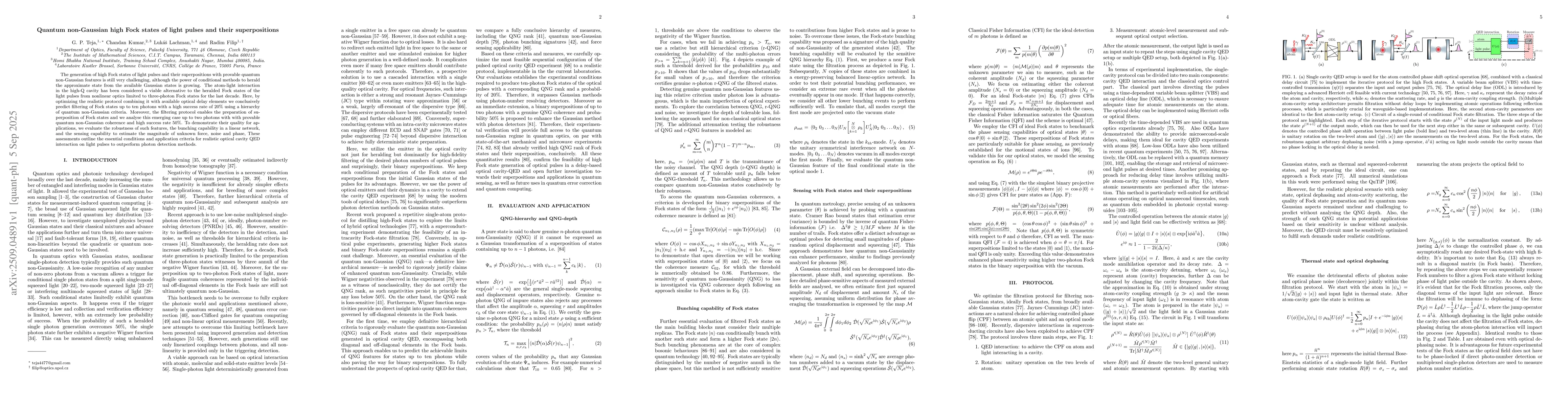 The generation of high Fock states of light pulses and their superpositions with provable quantum non-Gaussian features is still very challenging, although the power of conditional methods to herald the approximate state from the available Gaussian states is growing. The atom-light interaction in the high-Q cavity has been considered a viable alternative to the heralded Fock states of the light pulses from nonlinear optics limited to three-photon Fock states for the last decade. Here, by optimizing the realistic protocol combining it with available optical delay elements we conclusively predict filtering of Fock states up to ten photons with a high success rate of $20\%$ using a hierarchy of quantum non-Gaussian criteria. Moreover, the filtering protocol enables the preparation of superposition of Fock states and we analyse this emerging case up to two photons with with provable quantum non-Gaussian coherence and high success rate $50\%$. To demonstrate their quality for applications, we evaluate the robustness of such features, the bunching capability in a linear network, and the sensing capability to estimate the magnitude of unknown force, noise and phase, These assessments outline the essential conditions and application criteria for realistic optical cavity QED interaction on light pulses to outperform photon detection methods.