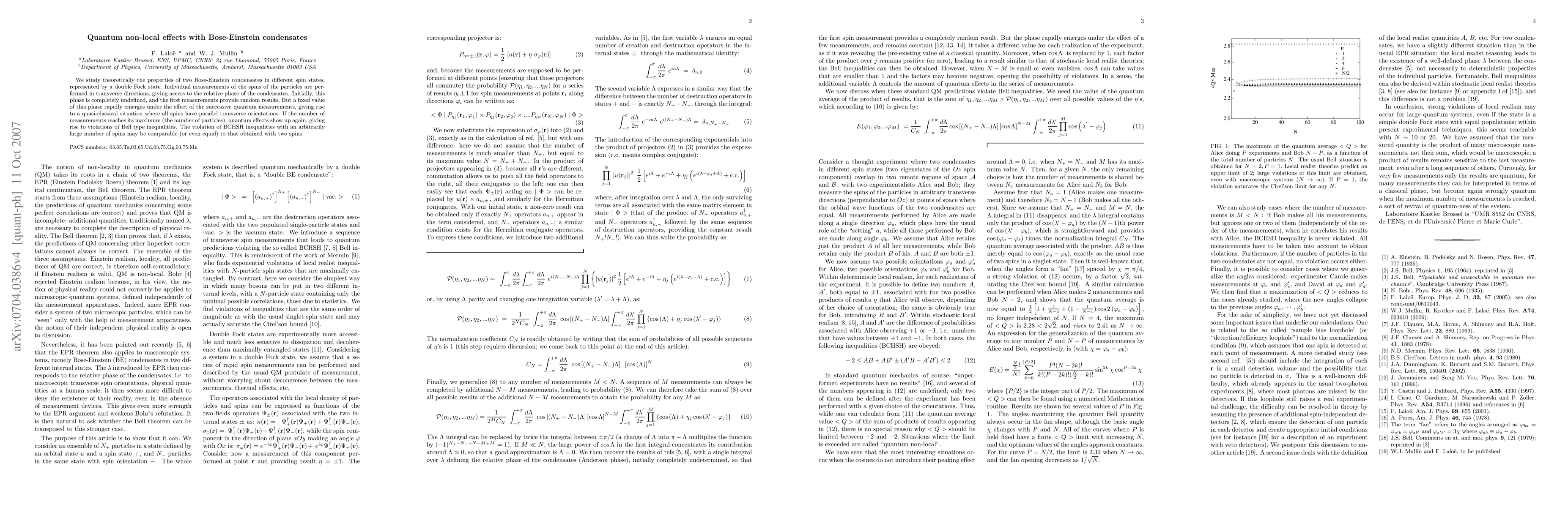 We study theoretically the properties of two Bose-Einstein condensates in different spin states, represented by a double Fock state. Individual measurements of the spins of the particles are performed in transverse directions, giving access to the relative phase of the condensates. Initially, this phase is completely undefined, and the first measurements provide random results. But a fixed value of this phase rapidly emerges under the effect of the successive quantum measurements, giving rise to a quasi-classical situation where all spins have parallel transverse orientations. If the number of measurements reaches its maximum (the number of particles), quantum effects show up again, giving rise to violations of Bell type inequalities. The violation of BCHSH inequalities with an arbitrarily large number of spins may be comparable (or even equal) to that obtained with two spins.