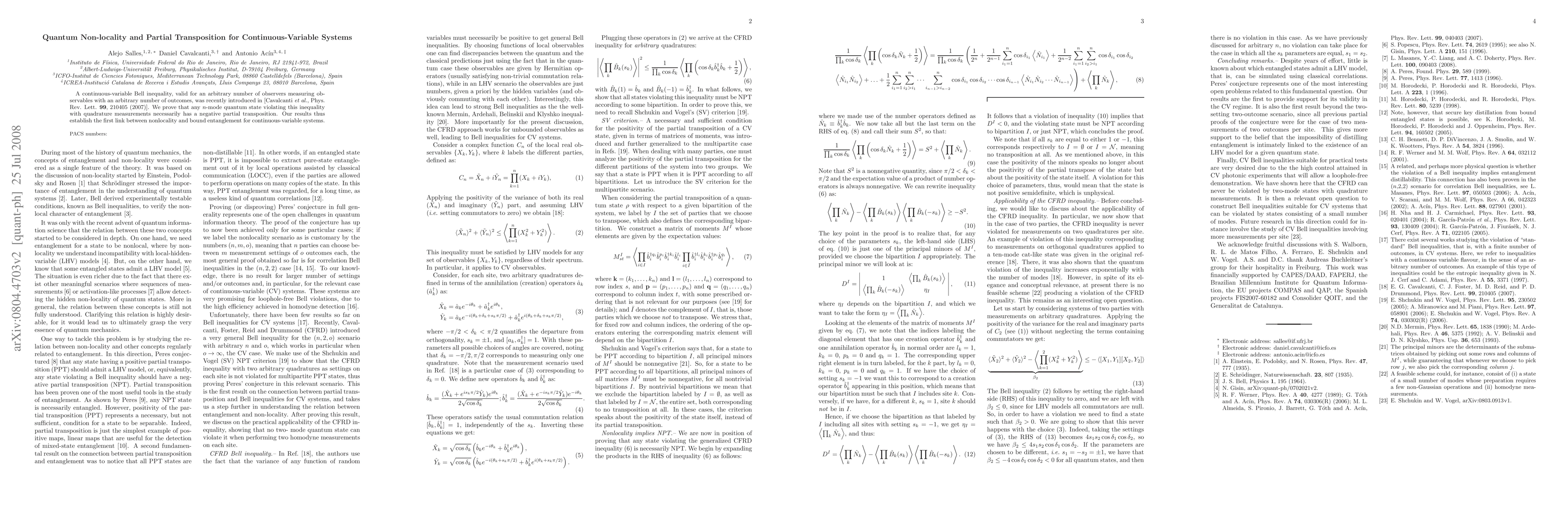 A study proves that continuous-variable systems violating a specific Bell inequality must have negative partial transposition, linking nonlocality to bound entanglement in quantum mechanics. This discovery establishes the first connection between these two phenomena for continuous-variable systems.
