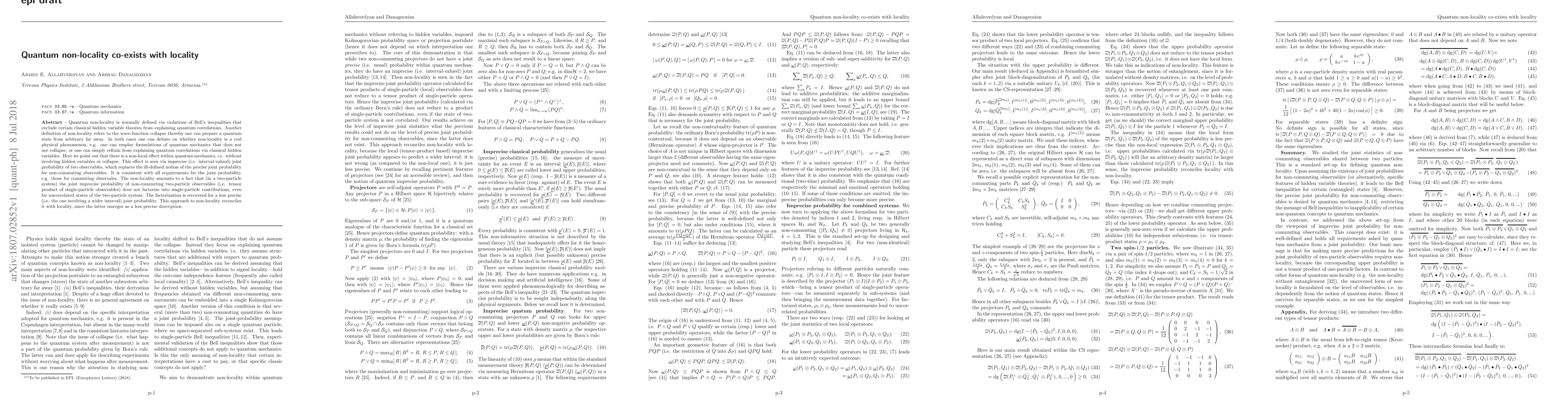 This paper demonstrates that quantum non-locality can coexist with locality through imprecise joint probabilities for non-commuting observables, showing that non-local effects arise without invoking hidden variables or wave-function collapse. The non-locality is reconciled with locality by recognizing that locality is a less precise description.