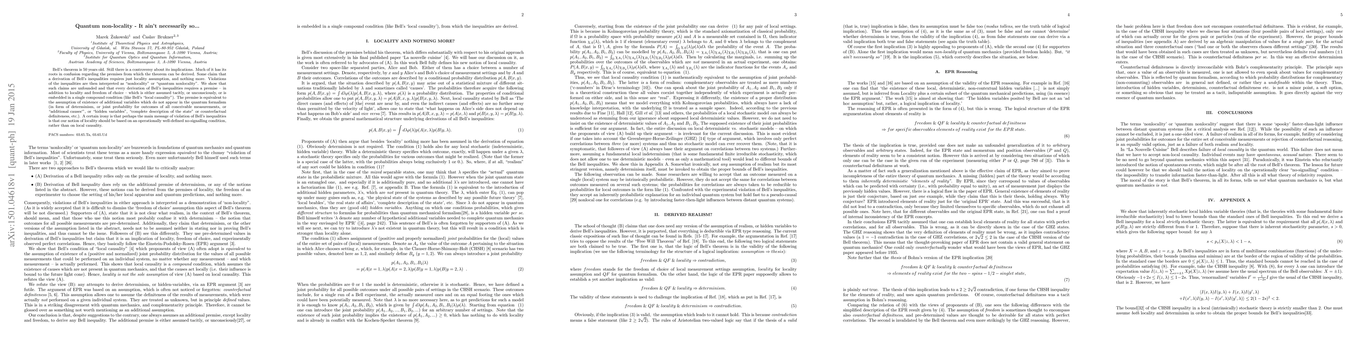 Bell's theorem is 50 years old. Still there is a controversy about its implications. Much of it has its roots in confusion regarding the premises from which the theorem can be derived. Some claim that a derivation of Bell's inequalities requires just locality assumption, and nothing more. Violations of the inequalities are then interpreted as ``nonlocality'' or ``quantum nonlocality''. We show that such claims are unfounded and that every derivation of Bell's inequalities requires a premise -- in addition to locality and freedom of choice -- which is either assumed tacitly, or unconsciously, or is embedded in a single compound condition (like Bell's ``local causality''). The premise is equivalent to the assumption of existence of additional variables which do not appear in the quantum formalism (in form of determinism, or joint probability for outcomes of all conceivable measurements, or ``additional causes`'', or ``hidden variables'', ``complete description of the state'' or counterfactual definiteness, etc.). A certain irony is that perhaps the main message of violation of Bell's inequalities is that our notion of locality should be based on an operationally well-defined no-signalling condition, rather than on local causality.