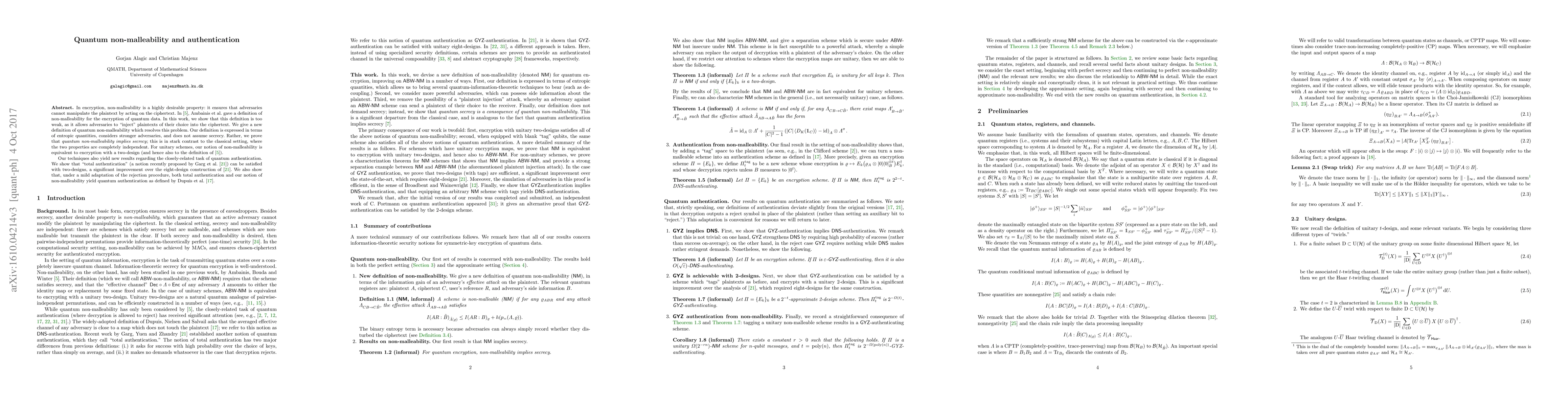 This paper proposes a stronger definition of quantum non-malleability that resolves weaknesses in previous definitions, proving that quantum non-malleability implies secrecy. It also introduces improved methods for quantum authentication using two-designs, significantly enhancing the efficiency over previous methods.