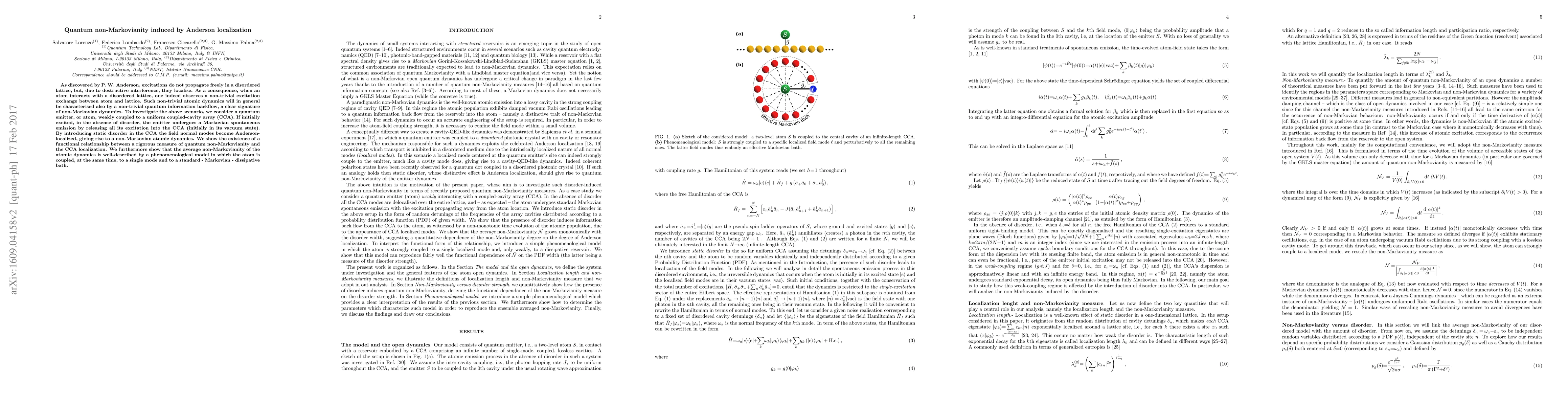As discovered by P. W. Anderson, excitations do not propagate freely in a disordered lattice, but, due to destructive interference, they localise. As a consequence when an atom interacts with a disordered lattice one indeed observes, a non-trivial excitation exchange between atom and lattice. Such non-trivial atomic dynamics will in general be characterised also by a non-trivial quantum information backflow, a clear signature of non-Markovian dynamics. To investigate the above scenario we consider a quantum emitter, or atom, weakly coupled to a uniform coupled-cavity array (CCA). If initially excited, in the absence of disorder, the emitter undergoes a Markovian spontaneous emission by releasing all its excitation into the CCA (initially in its vacuum state). By introducing static disorder in the CCA the field normal modes become Anderson-localized, giving rise to a non-Markovian atomic dynamics. We show the existence of a functional relationship between a rigorous measure of quantum non-Markovianity and the CCA localization. We furthermore show that the average non-Markovianity of the atomic dynamics is well-described by a phenomenological model in which the atom is coupled, at the same time, to a single mode and to a standard - Markovian - dissipative bath.