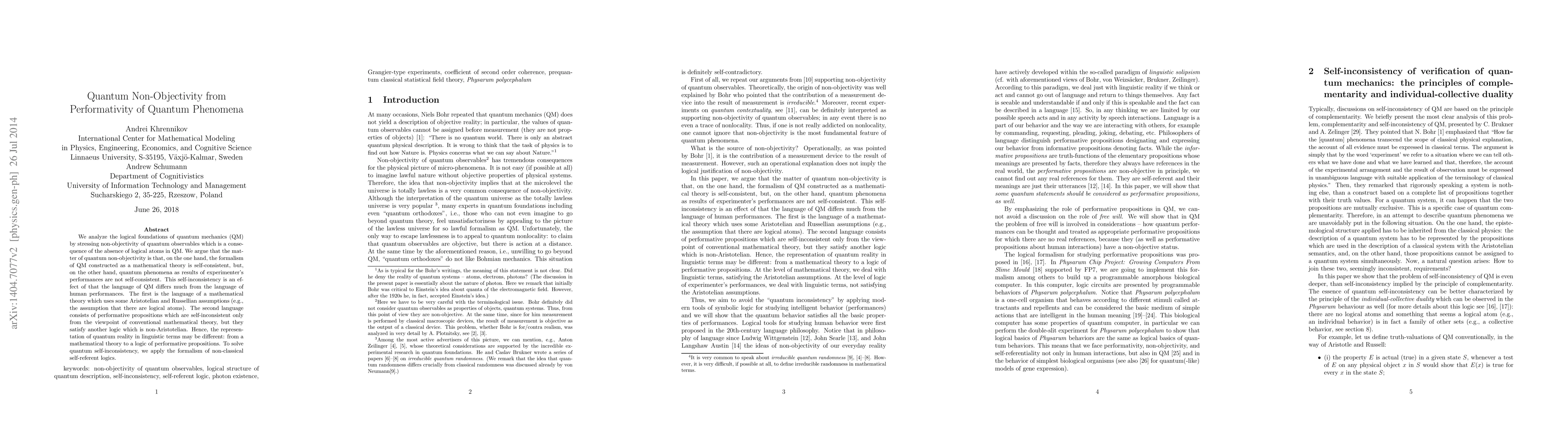 We analyze the logical foundations of quantum mechanics (QM) by stressing non-objectivity of quantum observables which is a consequence of the absence of logical atoms in QM. We argue that the matter of quantum non-objectivity is that, on the one hand, the formalism of QM constructed as a mathematical theory is self-consistent, but, on the other hand, quantum phenomena as results of experimenter's performances are not self-consistent. This self-inconsistency is an effect of that the language of QM differs much from the language of human performances. The first is the language of a mathematical theory which uses some Aristotelian and Russellian assumptions (e.g., the assumption that there are logical atoms). The second language consists of performative propositions which are self-inconsistent only from the viewpoint of conventional mathematical theory, but they satisfy another logic which is non-Aristotelian. Hence, the representation of quantum reality in linguistic terms may be different: from a mathematical theory to a logic of performative propositions. To solve quantum self-inconsistency, we apply the formalism of non-classical self-referent logics.