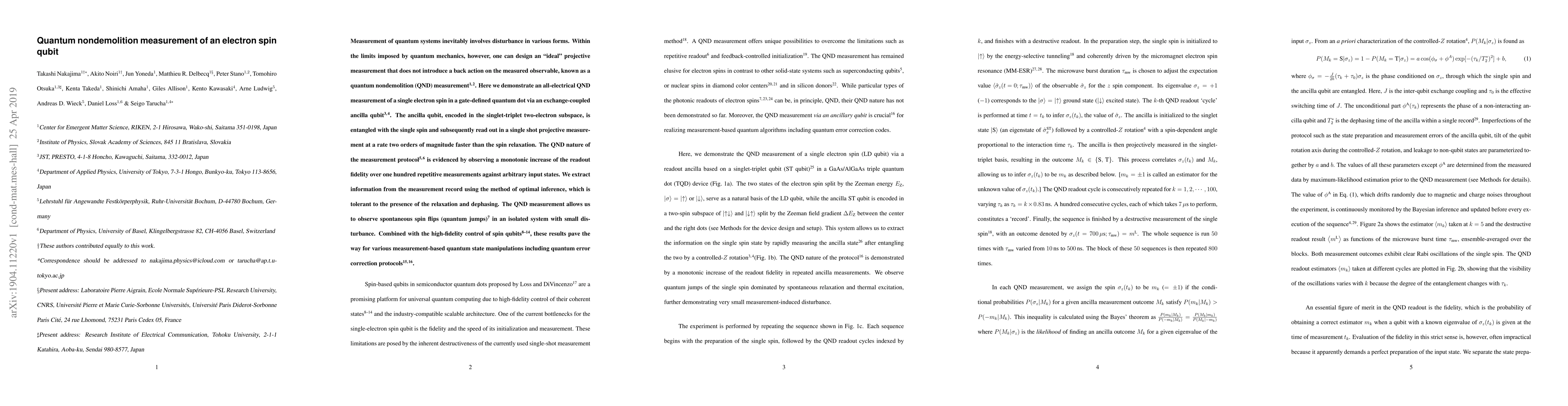 This paper demonstrates an all-electrical quantum nondemolition (QND) measurement of a single electron spin in a quantum dot using an exchange-coupled ancilla qubit, achieving high fidelity and allowing observation of spontaneous spin flips with minimal disturbance. The method enables potential applications in quantum error correction protocols.