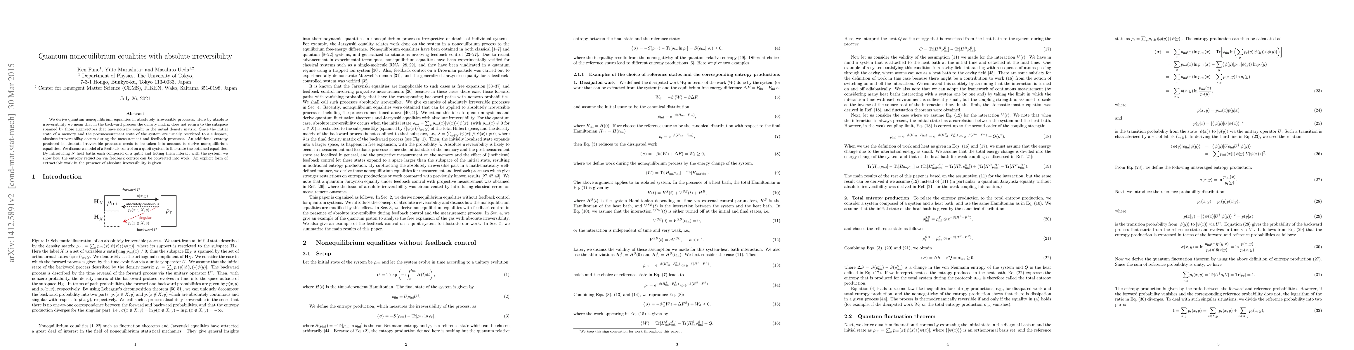 The paper derives quantum nonequilibrium equalities for absolutely irreversible processes, where backward density matrices do not return to initial subspaces, necessitating additional entropy consideration. A qubit system with feedback control illustrates these equalities, showing how entropy reduction through control can convert into work.