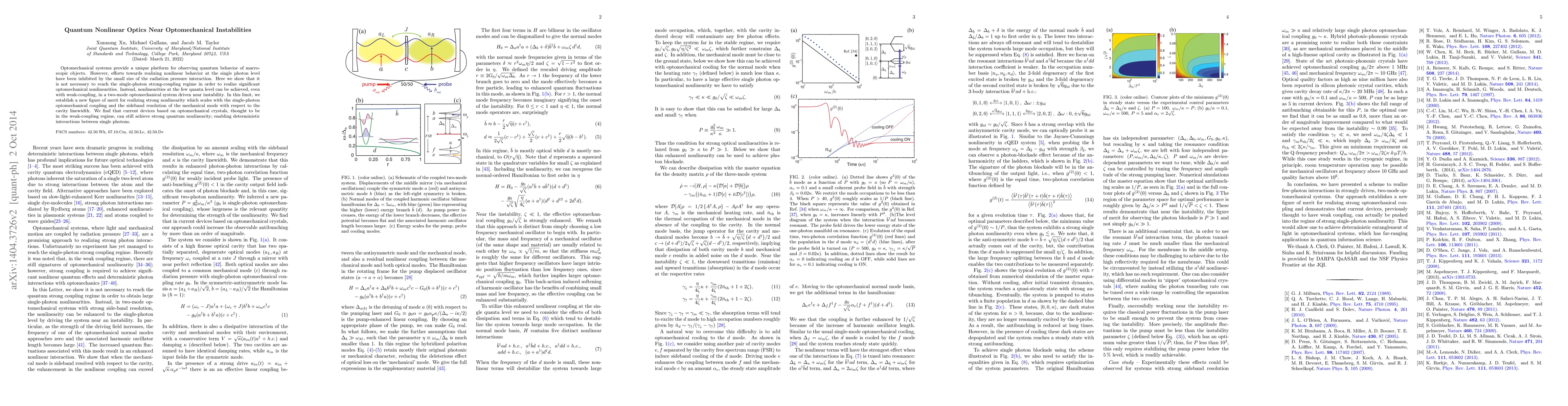 Optomechanical systems provide a unique platform for observing quantum behavior of macroscopic objects. However, efforts towards realizing nonlinear behavior at the single photon level have been inhibited by the small size of the radiation pressure interaction. Here we show that it is not necessary to reach the single-photon strong-coupling regime in order to realize significant optomechanical nonlinearities. Instead, nonlinearities at the few quanta level can be achieved, even with weak-coupling, in a two-mode optomechanical system driven near instability. In this limit, we establish a new figure of merit for realizing strong nonlinearity which scales with the single-photon optomechanical coupling and the sideband resolution of the mechanical mode with respect to the cavity linewidth. We find that current devices based on optomechanical crystals, thought to be in the weak-coupling regime, can still achieve strong quantum nonlinearity; enabling deterministic interactions between single photons.