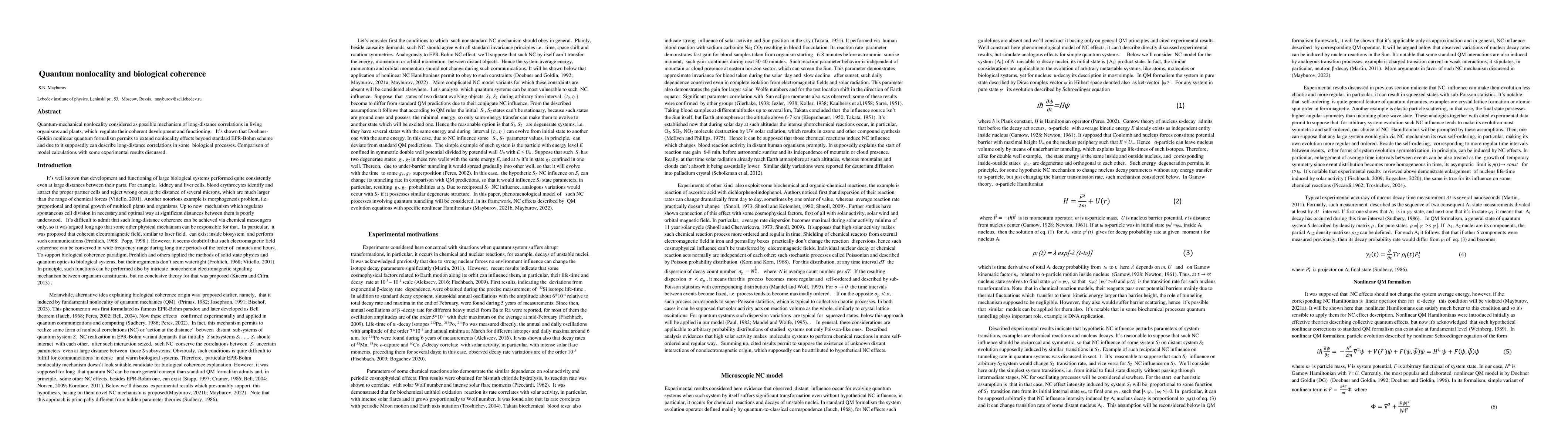 This paper explores quantum nonlocality as a potential mechanism for long-distance correlations in living organisms, suggesting that Doebner-Goldin nonlinear quantum formalism can extend these effects beyond the standard EPR-Bohm model, potentially explaining coherent biological processes. Experimental results are compared to support these findings.