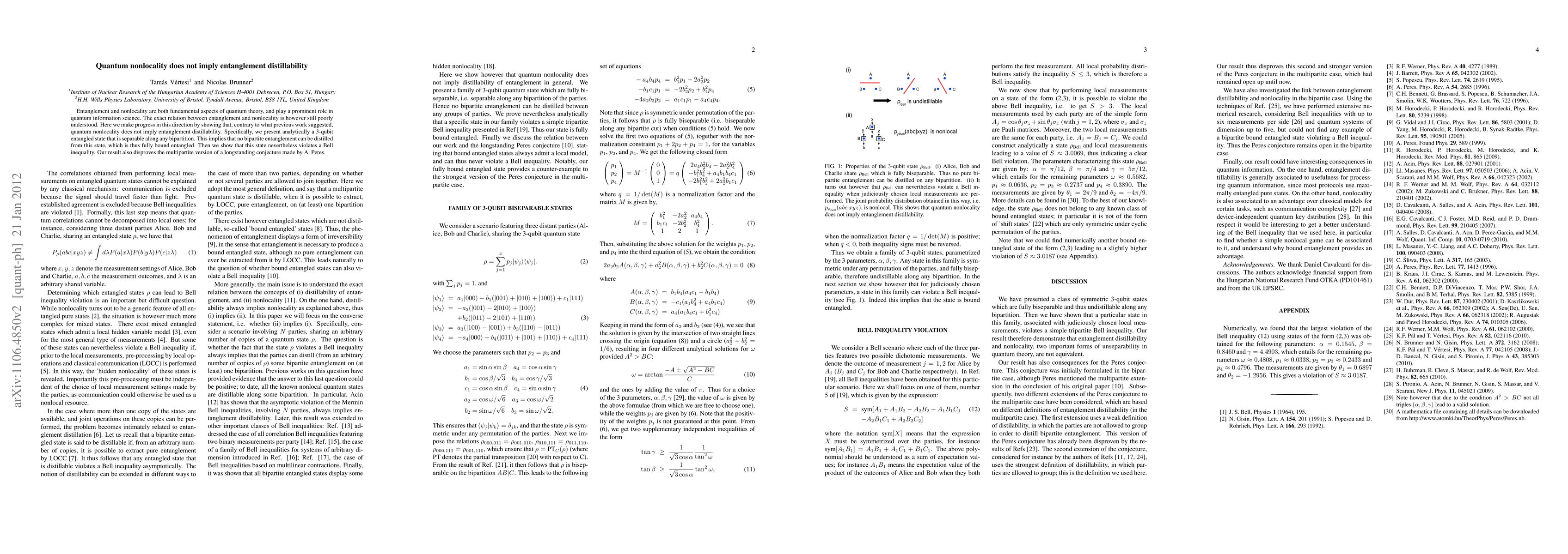 This paper demonstrates that quantum nonlocality does not imply entanglement distillability by presenting a 3-qubit state that violates a Bell inequality but is separable along any bipartition, thus fully bound entangled and disproving a longstanding conjecture.
