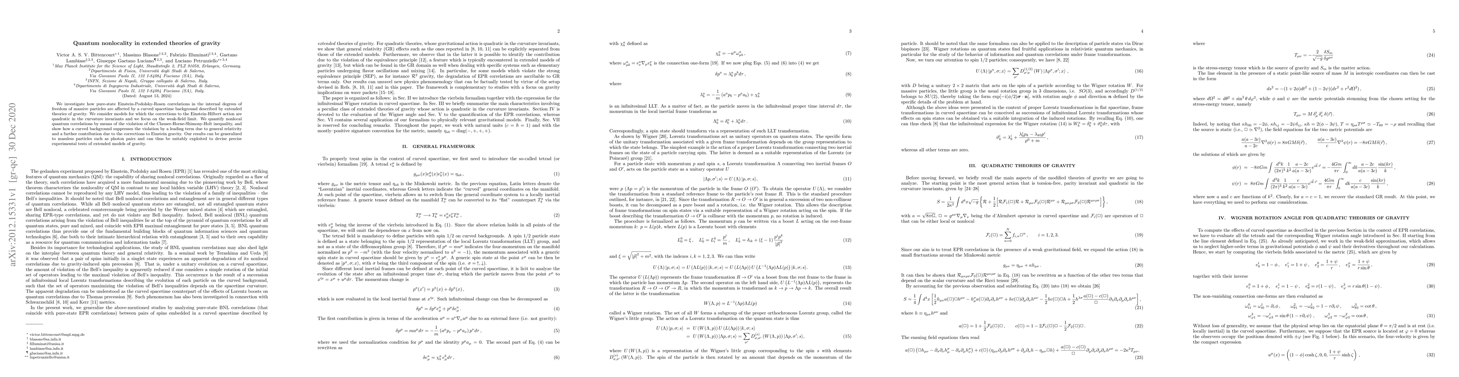 We investigate how pure-state Einstein-Podolsky-Rosen correlations in the internal degrees of freedom of massive particles are affected by a curved spacetime background described by extended theories of gravity. We consider models for which the corrections to the Einstein-Hilbert action are quadratic in the curvature invariants and we focus on the weak-field limit. We quantify nonlocal quantum correlations by means of the violation of the Clauser-Horne-Shimony-Holt inequality, and show how a curved background suppresses the violation by a leading term due to general relativity and a further contribution due to the corrections to Einstein gravity. Our results can be generalized to massless particles such as photon pairs and can thus be suitably exploited to devise precise experimental tests of extended models of gravity.
