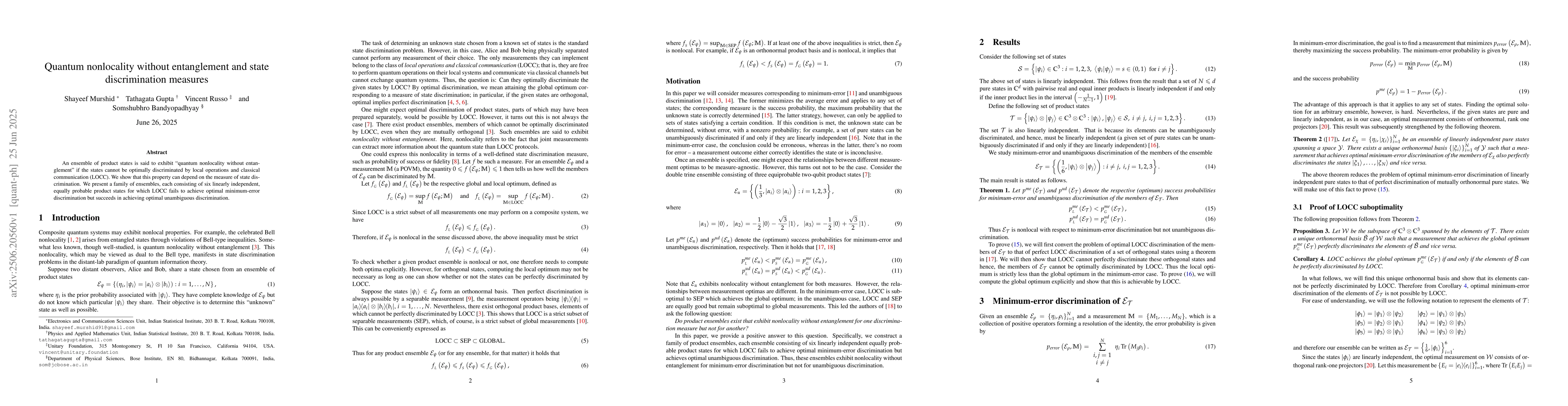 The research introduces 'quantum nonlocality without entanglement', demonstrating that certain product state ensembles can't be optimally discriminated via local operations and classical communication (LOCC). This nonlocality depends on the discrimination measure used; some ensembles allow for successful unambiguous discrimination by LOCC, but not optimal minimum-error discrimination.