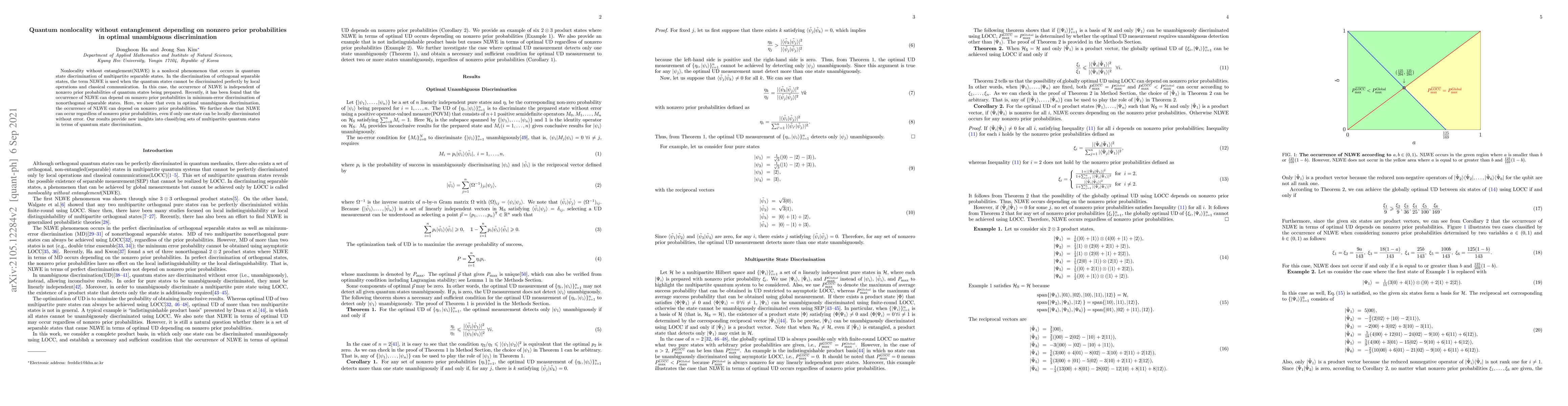 Nonlocality without entanglement(NLWE) is a nonlocal phenomenon that occurs in quantum state discrimination of multipartite separable states. In the discrimination of orthogonal separable states, the term NLWE is used when the quantum states cannot be discriminated perfectly by local operations and classical communication. In this case, the occurrence of NLWE is independent of nonzero prior probabilities of quantum states being prepared. Recently, it has been found that the occurrence of NLWE can depend on nonzero prior probabilities in minimum-error discrimination of nonorthogonal separable states. Here, we show that even in optimal unambiguous discrimination, the occurrence of NLWE can depend on nonzero prior probabilities. We further show that NLWE can occur regardless of nonzero prior probabilities, even if only one state can be locally discriminated without error. Our results provide new insights into classifying sets of multipartite quantum states in terms of quantum state discrimination.