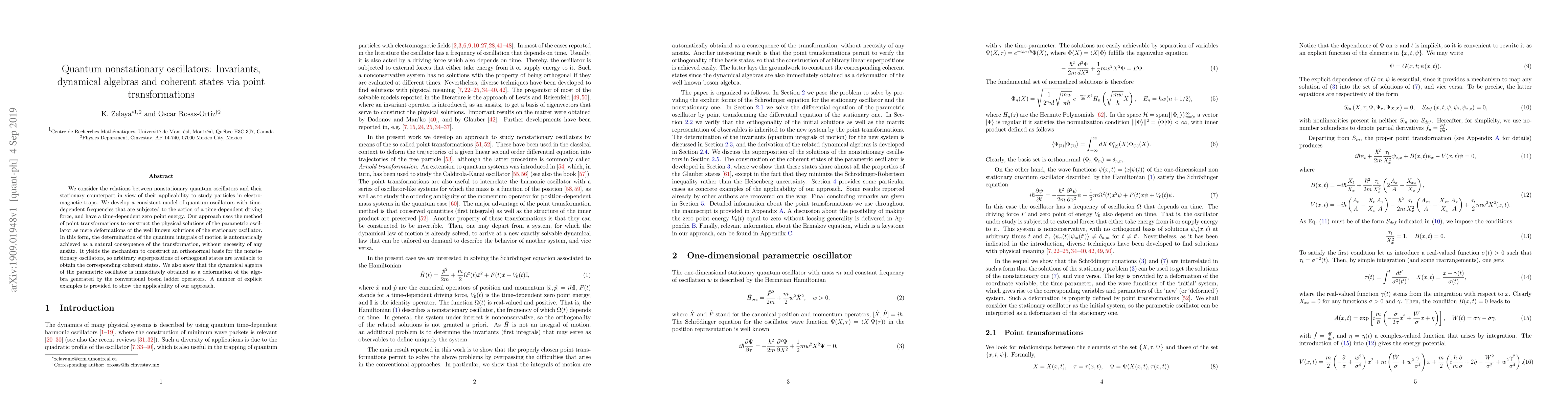 We consider the relations between nonstationary quantum oscillators and their stationary counterpart in view of their applicability to study particles in electromagnetic traps. We develop a consistent model of quantum oscillators with time-dependent frequencies that are subjected to the action of a time-dependent driving force, and have a time-dependent zero point energy. Our approach uses the method of point transformations to construct the physical solutions of the parametric oscillator as mere deformations of the well known solutions of the stationary oscillator. In this form, the determination of the quantum integrals of motion is automatically achieved as a natural consequence of the transformation, without necessity of any ansatz. It yields the mechanism to construct an orthonormal basis for the nonstationary oscillators, so arbitrary superpositions of orthogonal states are available to obtain the corresponding coherent states. We also show that the dynamical algebra of the parametric oscillator is immediately obtained as a deformation of the algebra generated by the conventional boson ladder operators. A number of explicit examples is provided to show the applicability of our approach.