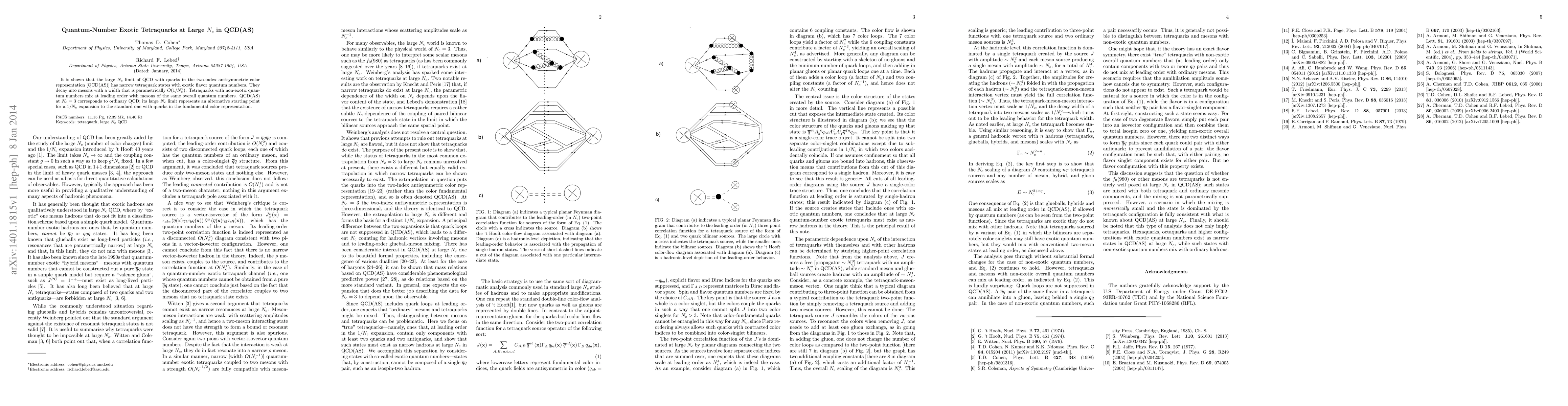 This paper demonstrates that QCD with quarks in the antisymmetric color representation (QCD(AS)) exhibits narrow tetraquark states with exotic flavor quantum numbers in the large $N_c$ limit, which decay into mesons with a width proportional to $O(1/N_c^2)$. The study suggests an alternative $1/N_c$ expansion framework compared to standard QCD.
