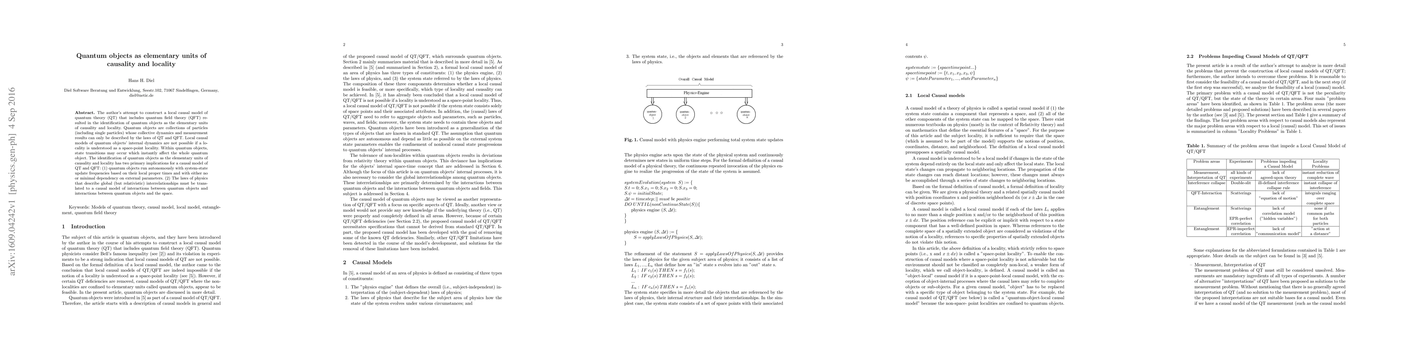 The author's attempt to construct a local causal model of quantum theory (QT) that includes quantum field theory (QFT) resulted in the identification of "quantum objects" as the elementary units of causality and locality. Quantum objects are collections of particles (including single particles) whose collective dynamics and measurement results can only be described by the laws of QT and QFT. Local causal models of quantum objects' internal dynamics are not possible if a locality is understood as a space-point locality. Within quantum objects, state transitions may occur which instantly affect the whole quantum object. The identification of quantum objects as the elementary units of causality and locality has two primary implications for a causal model of quantum objects: (1) quantum objects run autonomously with system-state update frequencies based on their local proper times and with either no or minimal dependency on external parameters. (2) The laws of physics that describe global (but relativistic) interrelationships must be translated to a causal model of interactions between quantum objects and interactions between quantum objects and the space.