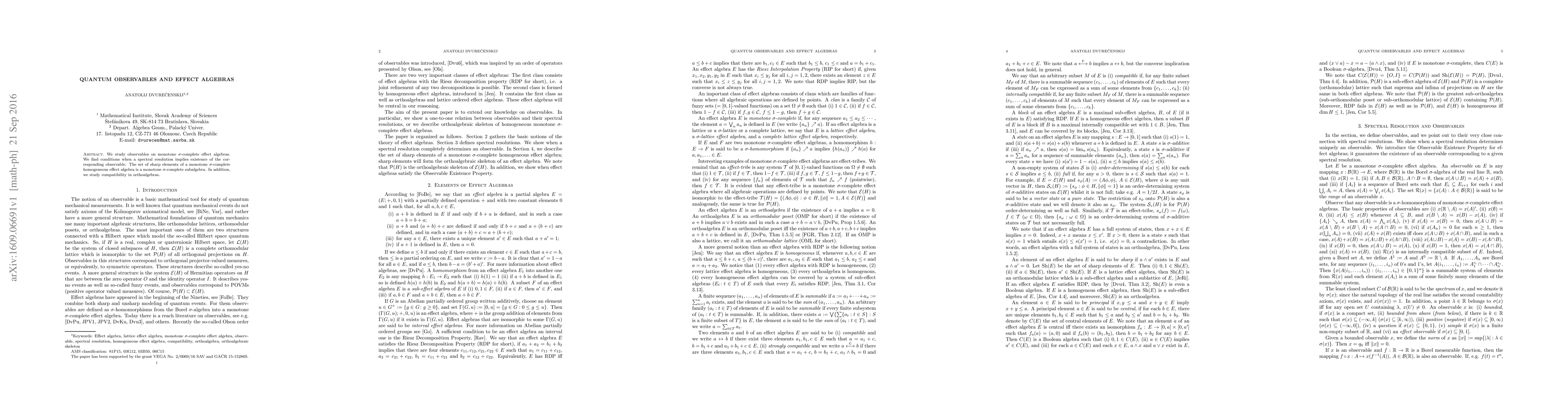 We study observables on monotone $\sigma$-complete effect algebras. We find conditions when a spectral resolution implies existence of the corresponding observable. The set of sharp elements of a monotone $\sigma$-complete homogeneous effect algebra is a monotone $\sigma$-complete subalgebra. In addition, we study compatibility in orthoalgebras.