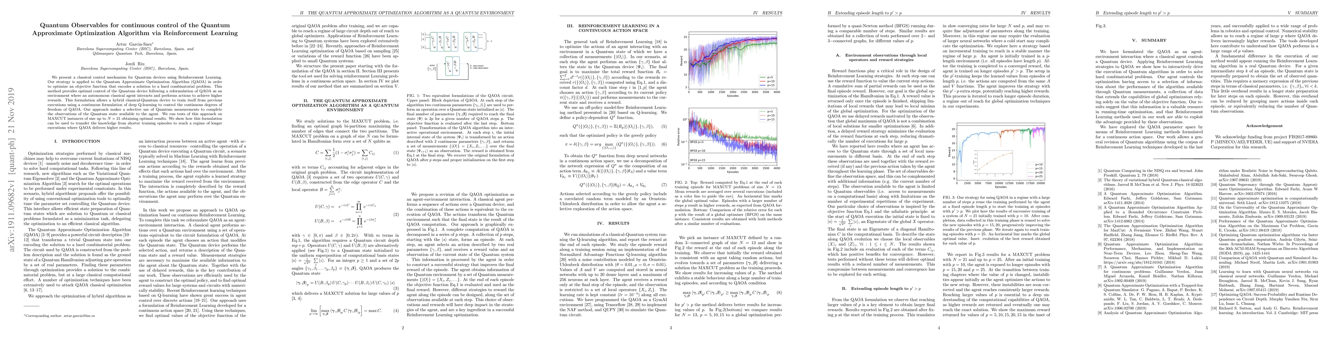 We present a classical control mechanism for Quantum devices using Reinforcement Learning. Our strategy is applied to the Quantum Approximate Optimization Algorithm (QAOA) in order to optimize an objective function that encodes a solution to a hard combinatorial problem. This method provides optimal control of the Quantum device following a reformulation of QAOA as an environment where an autonomous classical agent interacts and performs actions to achieve higher rewards. This formulation allows a hybrid classical-Quantum device to train itself from previous executions using a continuous formulation of deep Q-learning to control the continuous degrees of freedom of QAOA. Our approach makes a selective use of Quantum measurements to complete the observations of the Quantum state available to the agent. We run tests of this approach on MAXCUT instances of size up to N = 21 obtaining optimal results. We show how this formulation can be used to transfer the knowledge from shorter training episodes to reach a regime of longer executions where QAOA delivers higher results.