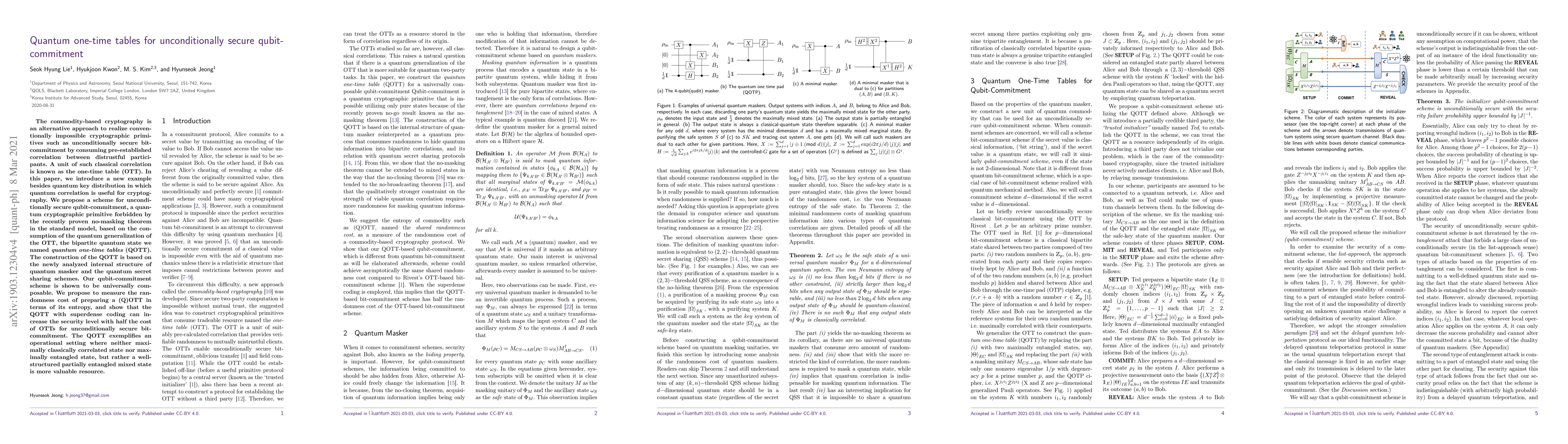 This paper proposes a quantum one-time table (QOTT) for unconditionally secure qubit-commitment, leveraging quantum correlations to achieve a cryptographic primitive previously deemed impossible. The scheme is shown to be universally composable and demonstrates enhanced security efficiency compared to classical one-time tables.