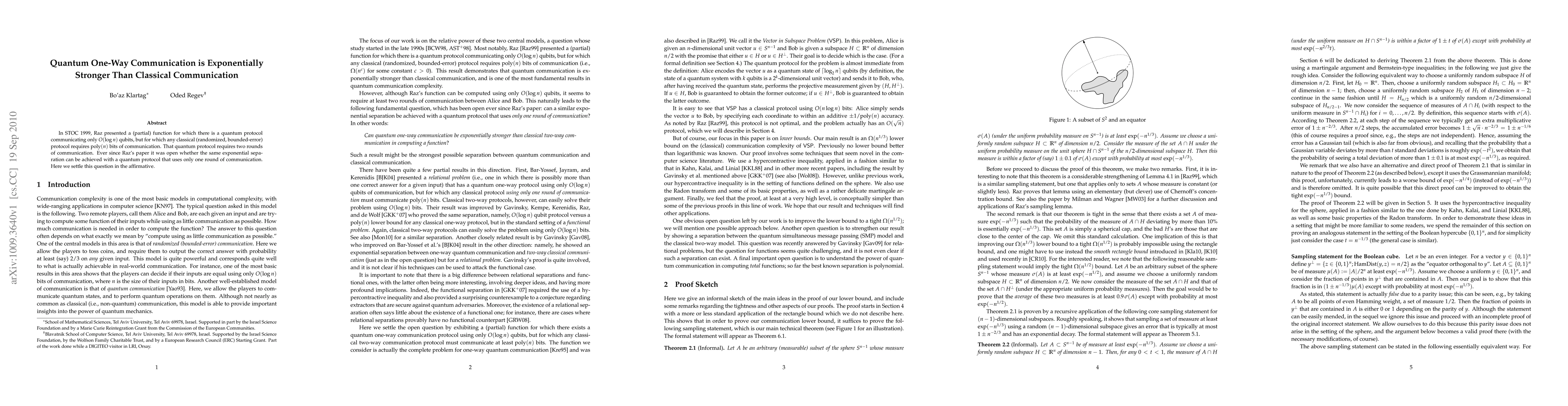 A research paper shows that quantum communication can outperform classical communication exponentially in a one-round protocol, settling an open question from 1999.