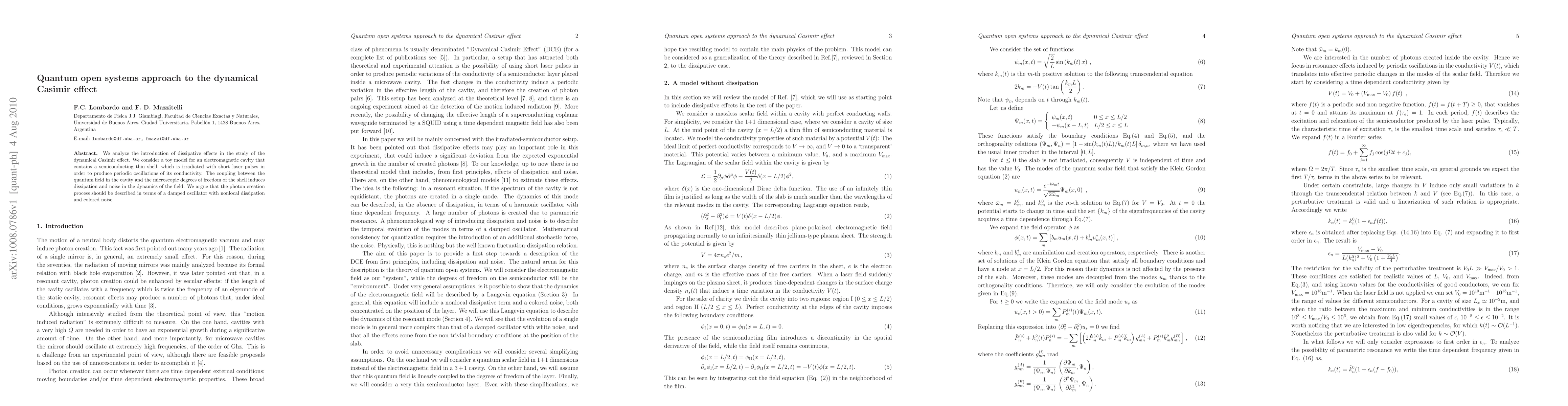 We analyze the introduction of dissipative effects in the study of the dynamical Casimir effect. We consider a toy model for an electromagnetic cavity that contains a semiconducting thin shell, which is irradiated with short laser pulses in order to produce periodic oscillations of its conductivity. The coupling between the quantum field in the cavity and the microscopic degrees of freedom of the shell induces dissipation and noise in the dynamics of the field. We argue that the photon creation process should be described in terms of a damped oscillator with nonlocal dissipation and colored noise.