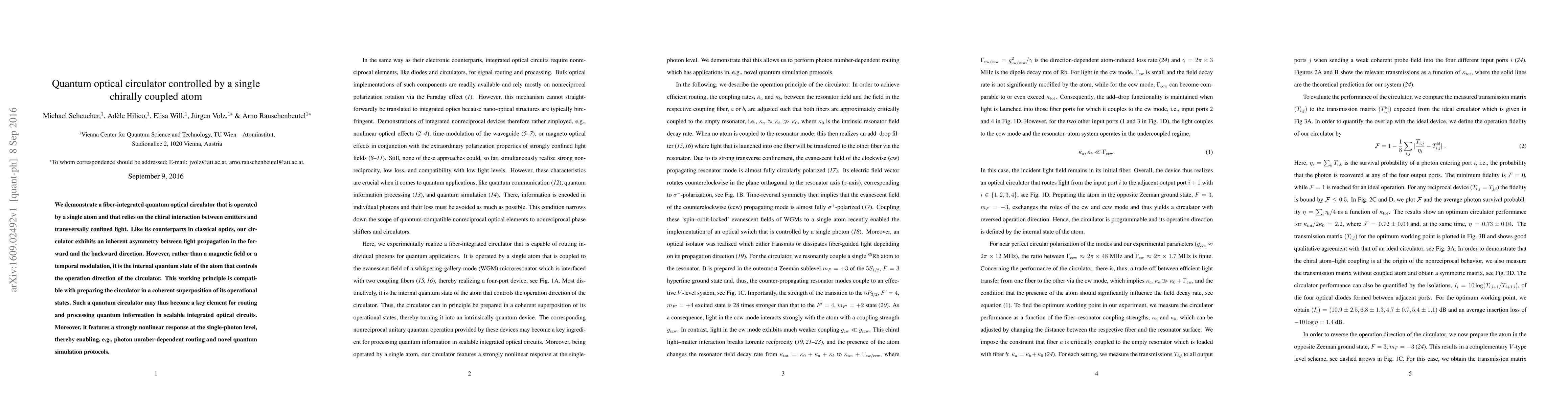 This paper presents a fiber-integrated quantum optical circulator controlled by a single chirally coupled atom, utilizing the chiral interaction between emitters and light. The atom's quantum state determines the operational direction, enabling scalable quantum information routing and nonlinear single-photon responses.