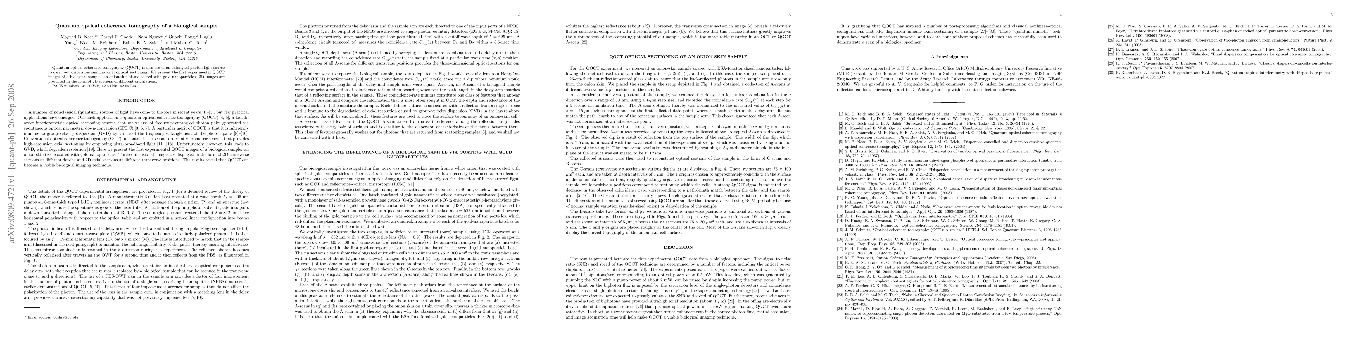 This paper demonstrates the first experimental application of quantum optical coherence tomography (QOCT) using an entangled-photon light source to achieve dispersion-immune axial optical sectioning in a biological sample. The study presents 3D images of onion-skin tissue coated with gold nanoparticles in the form of 2D sections from different orientations.