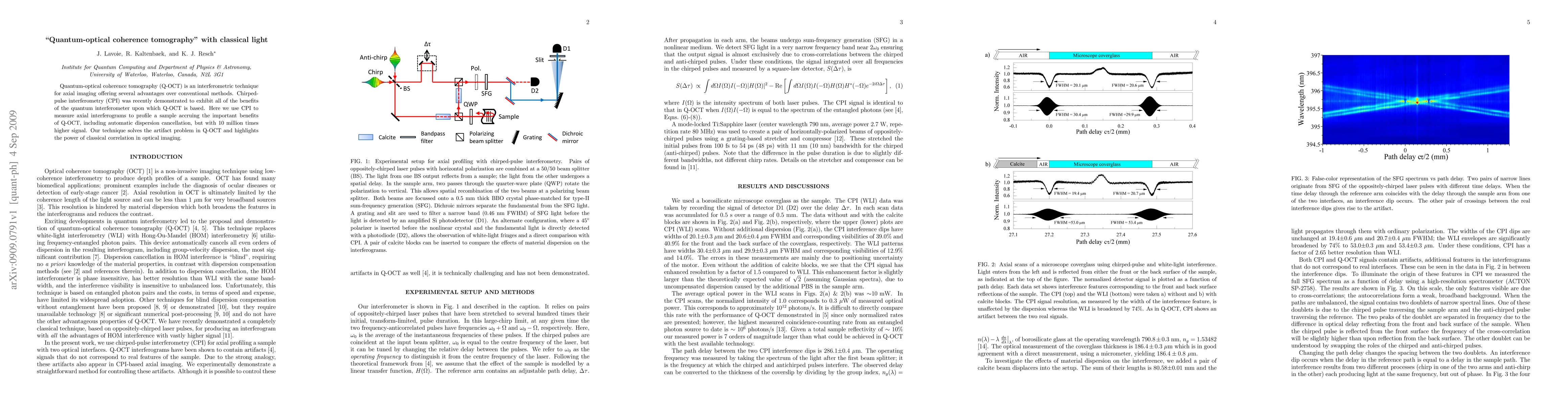 This paper demonstrates the use of chirped-pulse interferometry (CPI) to achieve the benefits of quantum-optical coherence tomography (Q-OCT) with classical light, offering automatic dispersion cancellation and a significantly higher signal, thus solving the artifact problem in Q-OCT.