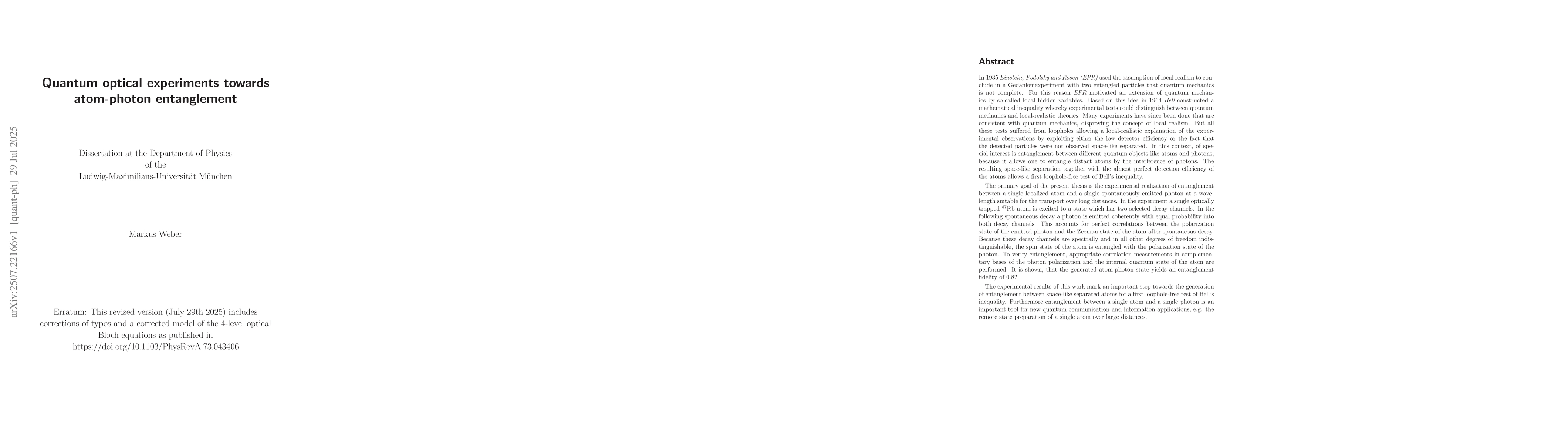 In 1935 EPR used the assumption of local realism to conclude in a Gedankenexperiment with two entangled particles that quantum mechanics is not complete. Based on this idea Bell constructed an inequality whereby experimental tests could distinguish between quantum mechanics and local-realistic theories. Many experiments have since been done that are consistent with quantum mechanics, disproving the concept of local realism. But all these tests suffered from loopholes allowing a local-realistic explanation of the experimental observations. In this context, of special interest is entanglement between different quantum objects like atoms and photons, because it allows one to entangle distant atoms by the interference of photons. The resulting space-like separation together with the almost perfect detection efficiency of the atoms will allow a first event-ready Bell test closing detection and locality loopholes. The primary goal of the present thesis was the experimental realization of entanglement between a single localized atom and a single spontaneously emitted photon. In the experiment a single optically trapped R87 atom is excited to a state which has two selected decay channels. In the following spontaneous decay a photon is emitted coherently with equal probability into both decay channels. This accounts for perfect correlations between the polarization state of the emitted photon and the Zeeman state of the atom after spontaneous decay. Because these decay channels are spectrally and in all other degrees of freedom indistinguishable, the spin state of the atom is entangled with the polarization state of the photon. To verify entanglement, appropriate correlation measurements in complementary bases of the photon polarization and the internal quantum state of the atom were performed. It is shown, that the generated atom-photon state yields an entanglement fidelity of 0.82.