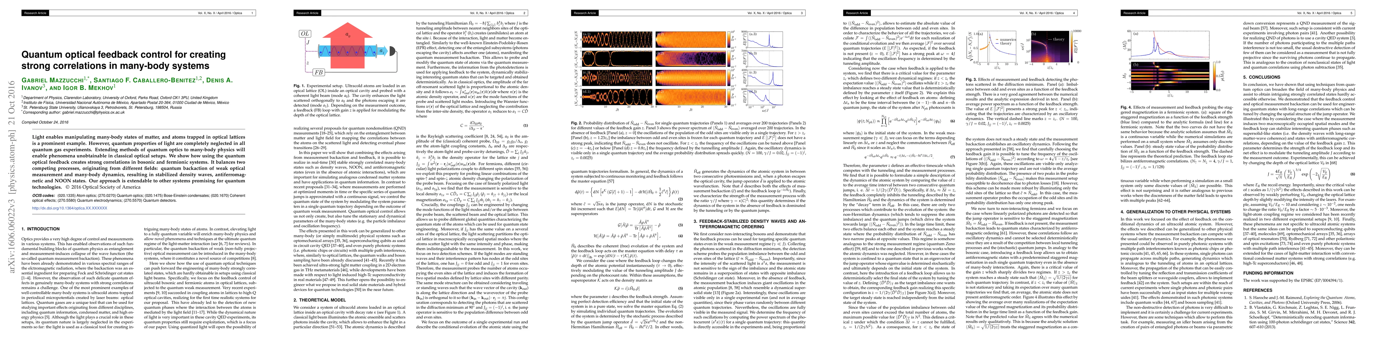 Light enables manipulating many-body states of matter, and atoms trapped in optical lattices is a prominent example. However, quantum properties of light are completely neglected in all quantum gas experiments. Extending methods of quantum optics to many-body physics will enable phenomena unobtainable in classical optical setups. We show how using the quantum optical feedback creates strong correlations in bosonic and fermionic systems. It balances two competing processes, originating from different fields: quantum backaction of weak optical measurement and many-body dynamics, resulting in stabilized density waves, antiferromagnetic and NOON states. Our approach is extendable to other systems promising for quantum technologies.