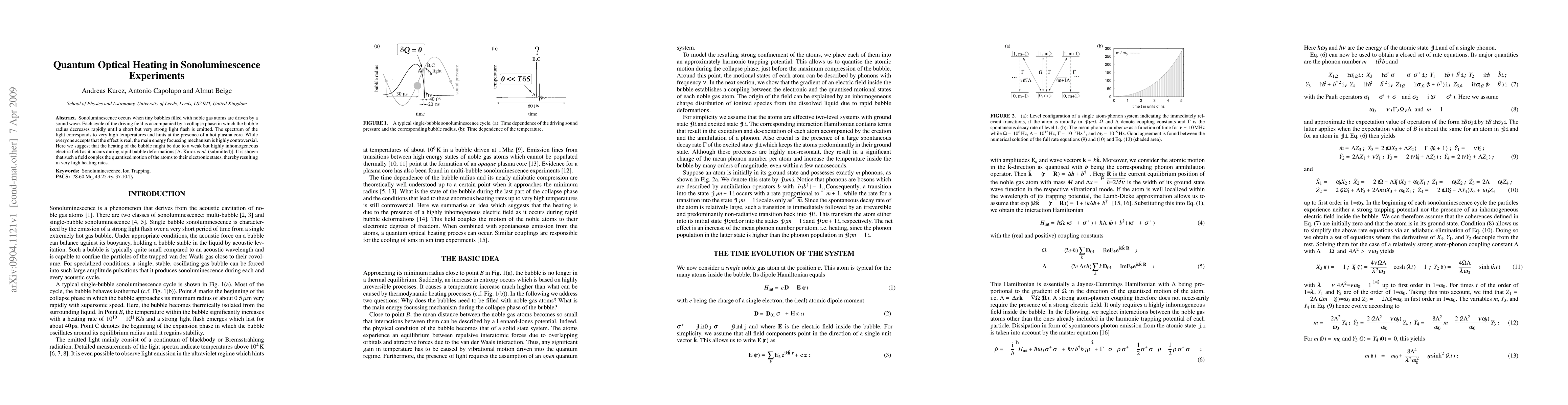 Sonoluminescence occurs when tiny bubbles rilled with noble gas atoms are driven by a sound wave. Each cycle of the driving field is accompanied by a collapse phase in which the bubble radius decreases rapidly until a short but very strong light flash is emitted. The spectrum of the light corresponds to very high temperatures and hints at the presence of a hot plasma core. While everyone accepts that the effect is real, the main energy focussing mechanism is highly controversial. Here we suggest that the heating of the bubble might be due to a weak but highly inhomogeneous electric field as it occurs during rapid bubble deformations [A. Kurcz et al. (submitted)]. It is shown that such a field couples the quantised motion of the atoms to their electronic states, thereby resulting in very high heating rates.