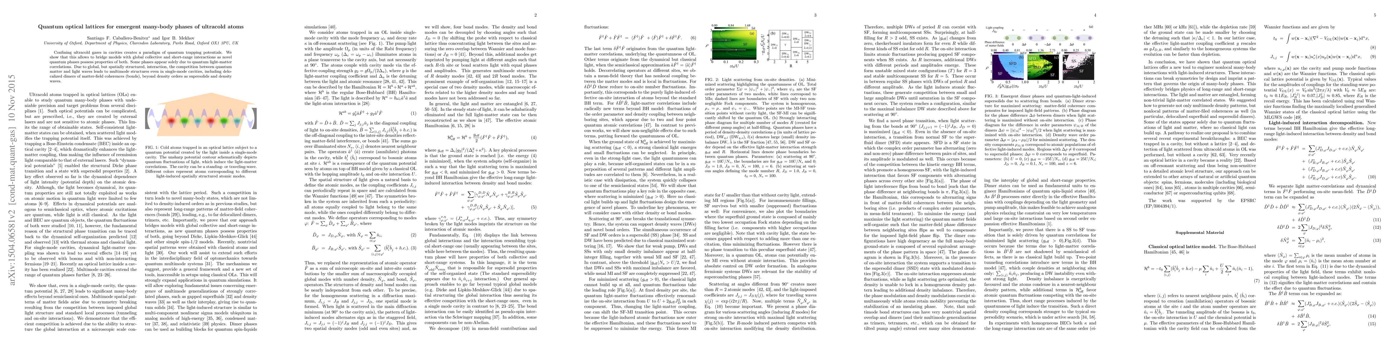 Confining ultracold gases in cavities creates a paradigm of quantum trapping potentials. We show that this allows to bridge models with global collective and short-range interactions as novel quantum phases possess properties of both. Some phases appear solely due to quantum light-matter correlations. Due to global, but spatially structured, interaction, the competition between quantum matter and light waves leads to multimode structures even in single-mode cavities, including delocalized dimers of matter-field coherences (bonds), beyond density orders as supersolids and density waves.