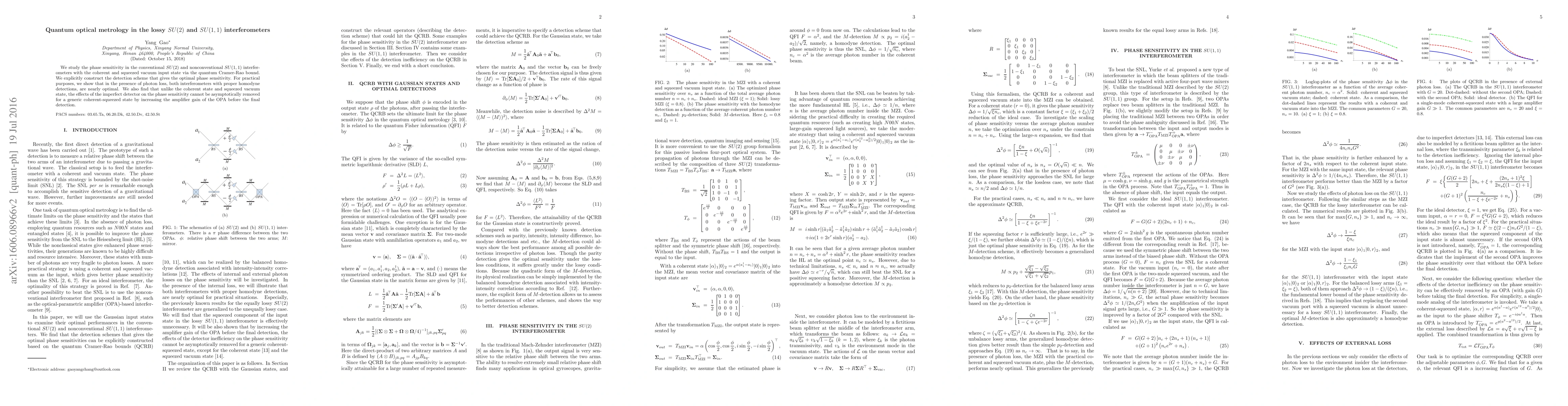 We study the phase sensitivity in the conventional $SU(2)$ and nonconventional $SU(1,1)$ interferometers with the coherent and squeezed vacuum input state via the quantum Cramer-Rao bound. We explicitly construct the detection scheme that gives the optimal phase sensitivity. For practical purposes, we show that in the presence of photon loss, both interferometers with proper homodyne detections, are nearly optimal. We also find that unlike the coherent state and squeezed vacuum state, the effects of the imperfect detector on the phase sensitivity cannot be asymptotically removed for a generic coherent-squeezed state by increasing the amplifier gain of the OPA.