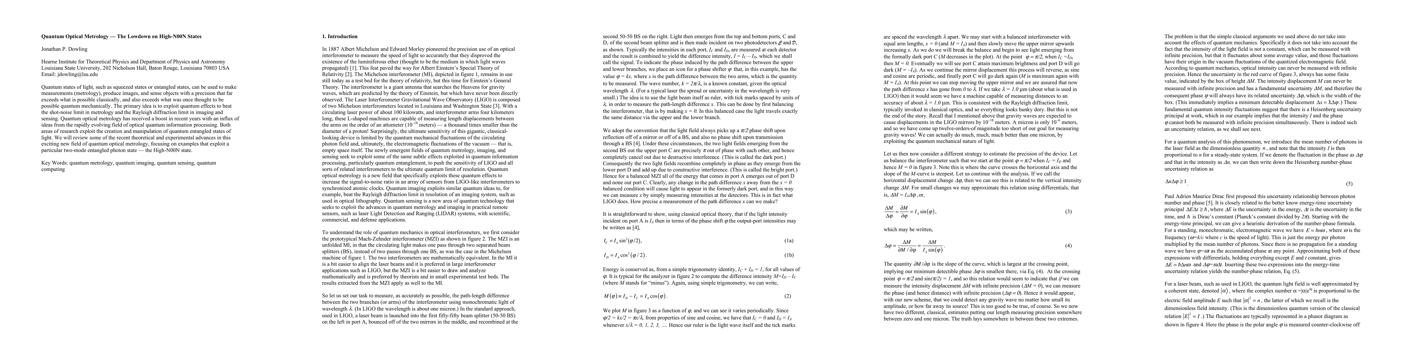 Quantum states of light, such as squeezed states or entangled states, can be used to make measurements (metrology), produce images, and sense objects with a precision that far exceeds what is possible classically, and also exceeds what was once thought to be possible quantum mechanically. The primary idea is to exploit quantum effects to beat the shot-noise limit in metrology and the Rayleigh diffraction limit in imaging and sensing. Quantum optical metrology has received a boost in recent years with an influx of ideas from the rapidly evolving field of optical quantum information processing. Both areas of research exploit the creation and manipulation of quantum-entangled states of light. We will review some of the recent theoretical and experimental advances in this exciting new field of quantum optical metrology, focusing on examples that exploit a particular two-mode entangled photon state -- the High-N00N state.