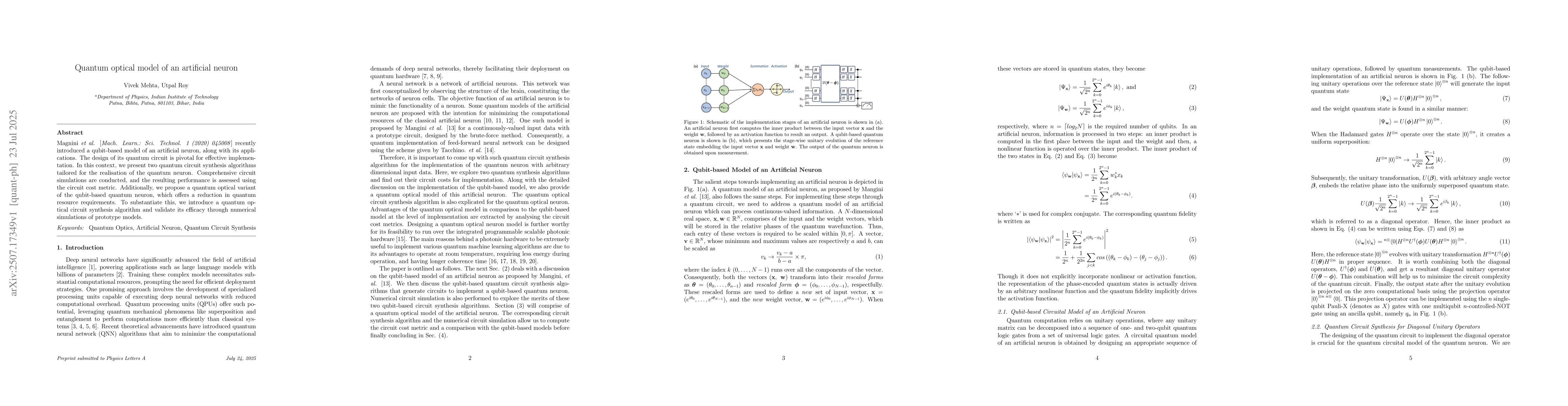 The paper presents two quantum circuit synthesis algorithms for realizing a qubit-based quantum neuron, followed by a proposal for a quantum optical variant with reduced quantum resource requirements. The algorithms are validated through numerical simulations using Qiskit.