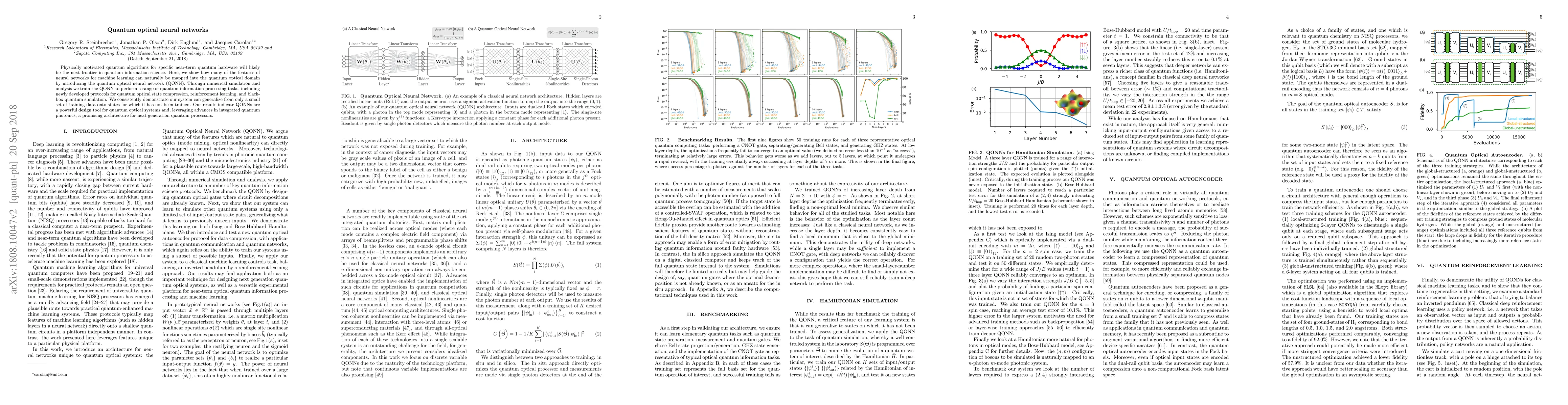 This paper introduces quantum optical neural networks (QONNs) as a framework to map machine learning neural networks into quantum optics, demonstrating their effectiveness in quantum information processing tasks such as state compression, reinforcement learning, and quantum simulation. The study shows that QONNs can generalize well from limited training data, suggesting they are a promising architecture for future quantum processors.