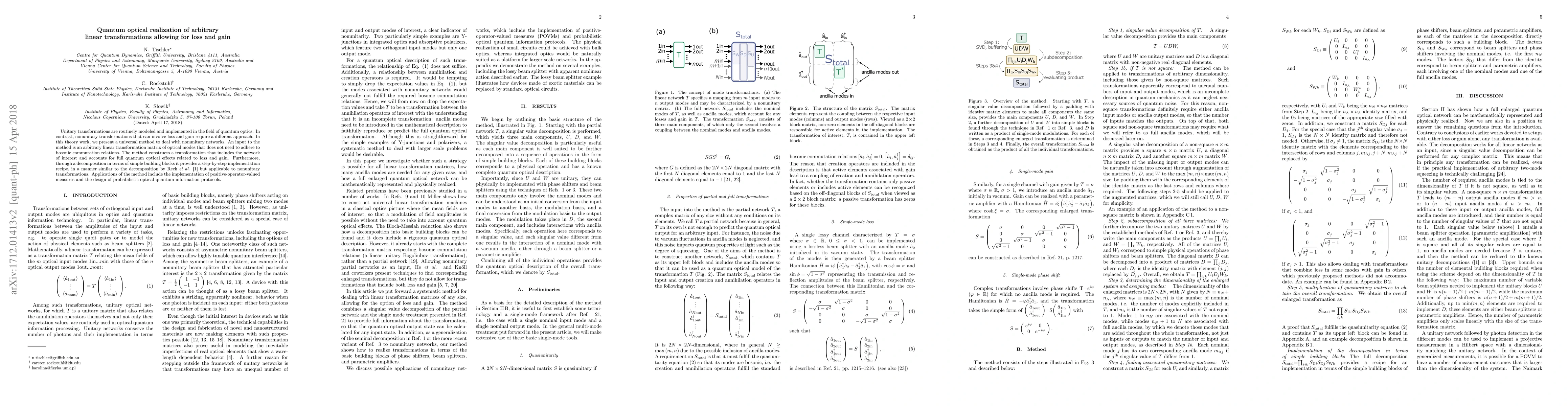 This paper proposes a universal method for implementing arbitrary linear transformations in quantum optics, including nonunitary transformations that account for loss and gain. The method provides a step-by-step implementation recipe through decomposition of the transformation into simple building blocks, applicable to a broader range of optical networks.