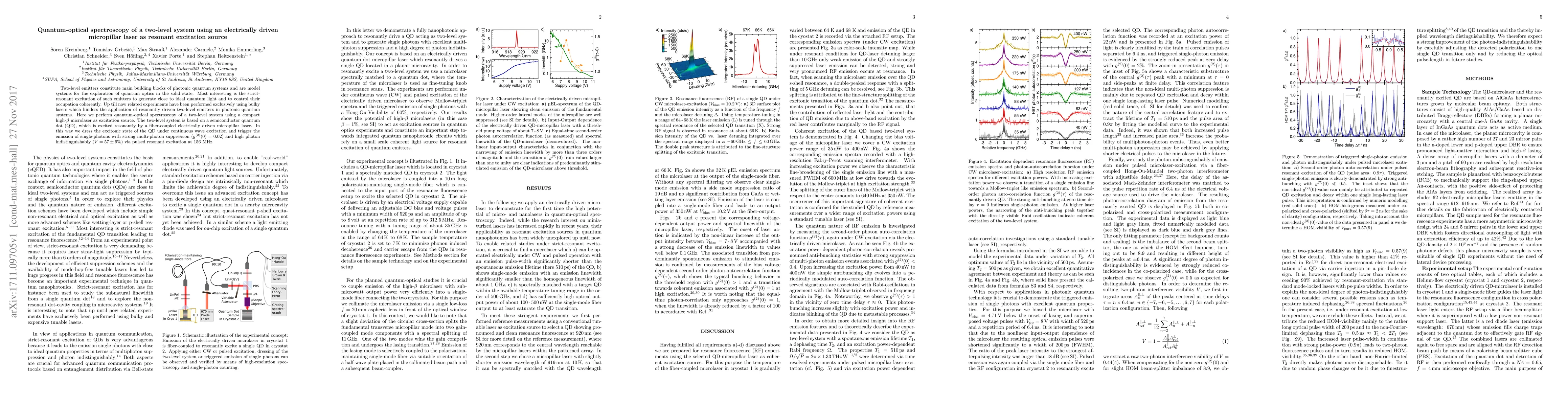 Two-level emitters constitute main building blocks of photonic quantum systems and are model systems for the exploration of quantum optics in the solid state. Most interesting is the strict-resonant excitation of such emitters to generate close to ideal quantum light and to control their occupation coherently. Up till now related experiments have been performed exclusively using bulky lasers which hinders the application of resonantly driven two-level emitters in photonic quantum systems. Here we perform quantum-optical spectroscopy of a two-level system using a compact high-$\beta$ microlaser as excitation source. The two-level system is based on a semiconductor quantum dot (QD), which is excited resonantly by a fiber-coupled electrically driven micropillar laser. In this way we dress the excitonic state of the QD under continuous wave excitation and trigger the emission of single-photons with strong multi-photon suppression ($g^{(2)}(0)=0.02$) and high photon indistinguishably ($V=57\pm9\%$) via pulsed resonant excitation at 156 MHz.