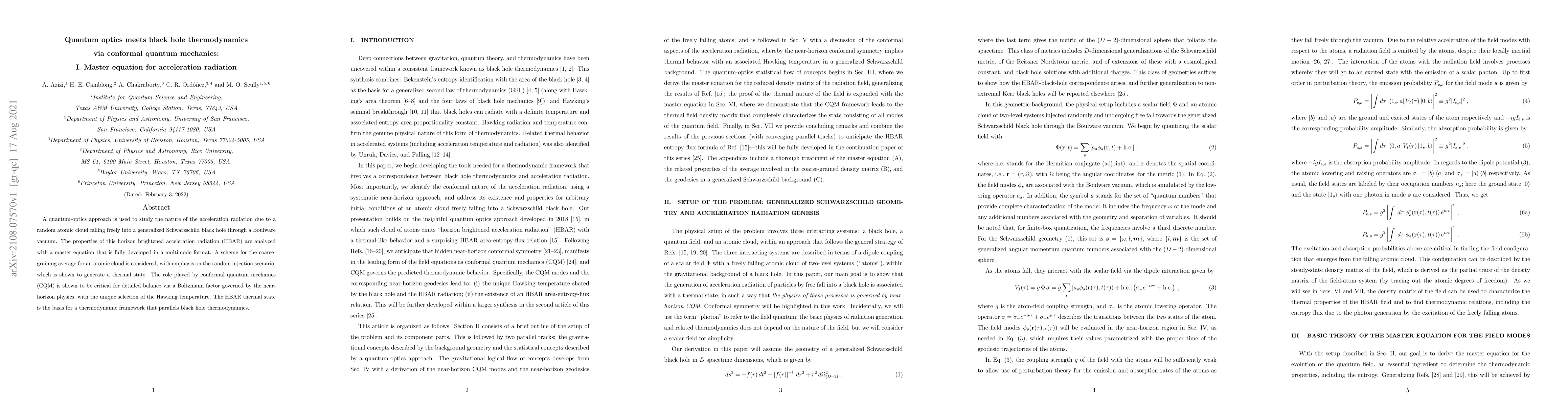 This paper employs quantum optics to investigate acceleration radiation from a freely falling atomic cloud into a generalized Schwarzschild black hole, revealing a thermal state via a master equation. Conformal quantum mechanics is crucial for establishing detailed balance and selecting the Hawking temperature, linking the horizon brightened acceleration radiation to black hole thermodynamics.