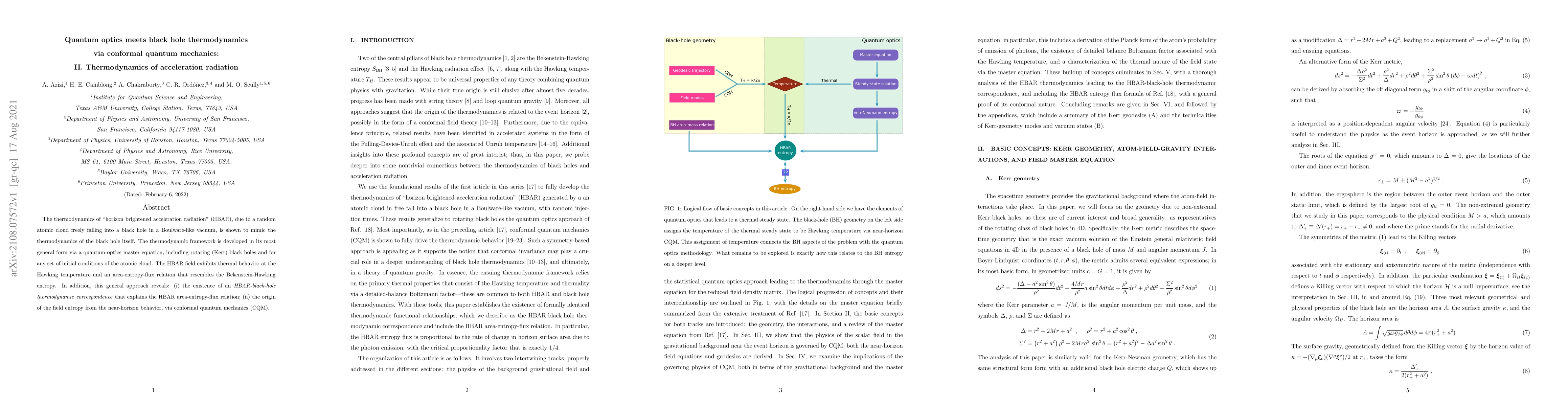 The thermodynamics of ``horizon brightened acceleration radiation'' (HBAR), due to a random atomic cloud freely falling into a black hole in a Boulware-like vacuum, is shown to mimic the thermodynamics of the black hole itself. The thermodynamic framework is developed in its most general form via a quantum optics master equation, including rotating (Kerr) black holes and for any set of initial conditions of the atomic cloud. The HBAR field exhibits thermal behavior at the Hawking temperature and an area-entropy-flux relation that resembles the Bekenstein-Hawking entropy. In addition, this general approach reveals:(i) the existence of an HBAR-black-hole thermodynamic correspondence that explains the HBAR area-entropy-flux relation;(ii) the origin of the field entropy from the near-horizon behavior, via conformal quantum mechanics (CQM).