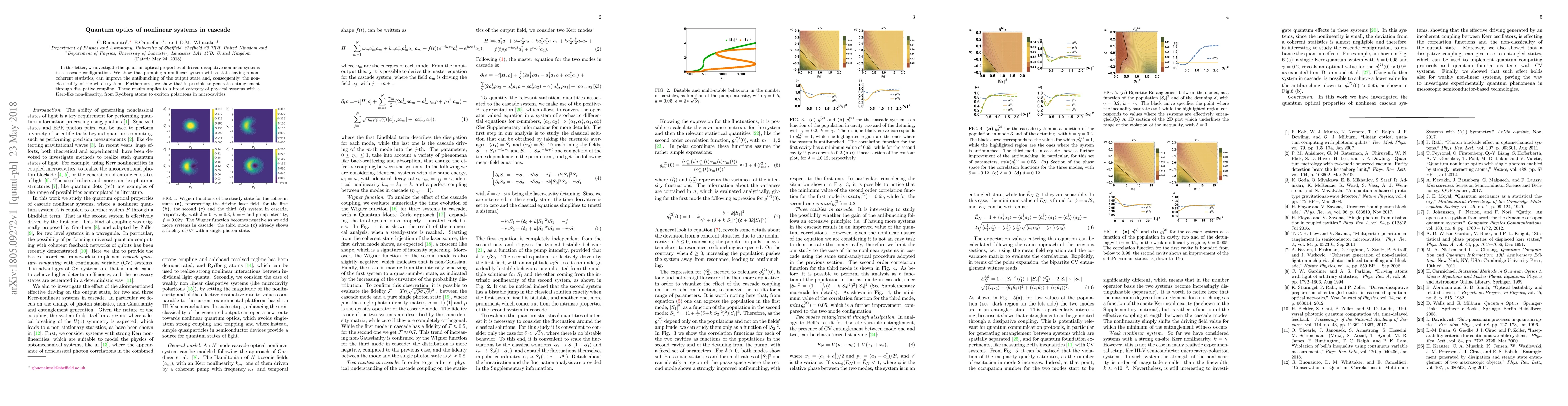 In this letter, we investigate the quantum optical properties of driven-dissipative nonlinear systems in a cascade configuration. We show that pumping a nonlinear system with a state having a noncoherent statistics, can improve the antibunching of the output state and, consequently, the nonclassicality of the whole system. Furthermore, we show that is possible to generate entanglement through dissipative coupling. These results applies to a broad category of physical systems with a Kerr-like non-linearity, from Rydberg atoms to exciton polaritons in microcavities.