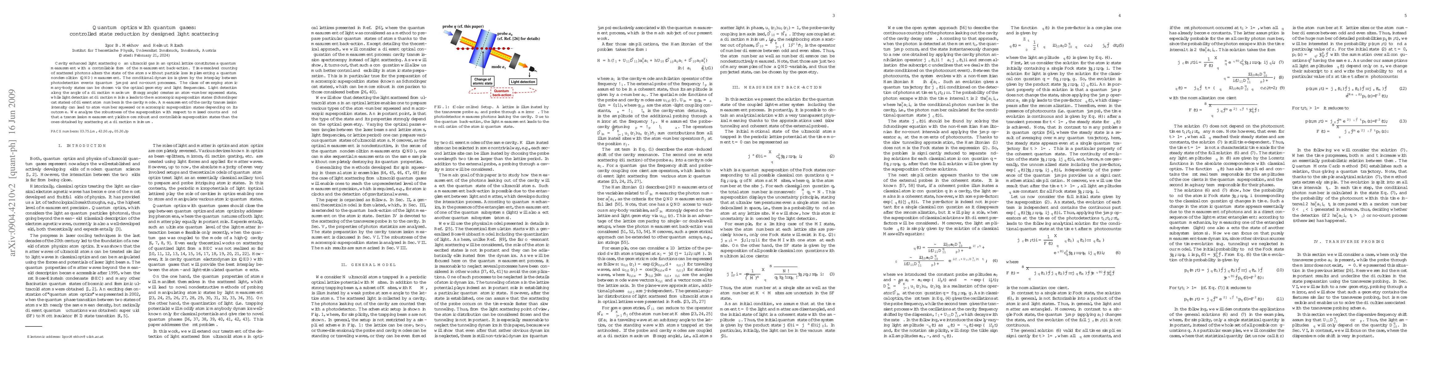 Cavity enhanced light scattering off an ultracold gas in an optical lattice constitutes a quantum measurement with a controllable form of the measurement back-action. Time-resolved counting of scattered photons alters the state of the atoms without particle loss implementing a quantum nondemolition (QND) measurement. The conditional dynamics is given by the interplay between photodetection events (quantum jumps) and no-count processes. The class of emerging atomic many-body states can be chosen via the optical geometry and light frequencies. Light detection along the angle of a diffraction maximum (Bragg angle) creates an atom-number squeezed state, while light detection at diffraction minima leads to the macroscopic superposition states (Schroedinger cat states) of different atom numbers in the cavity mode. A measurement of the cavity transmission intensity can lead to atom-number squeezed or macroscopic superposition states depending on its outcome. We analyze the robustness of the superposition with respect to missed counts and find that a transmission measurement yields more robust and controllable superposition states than the ones obtained by scattering at a diffraction minimum.