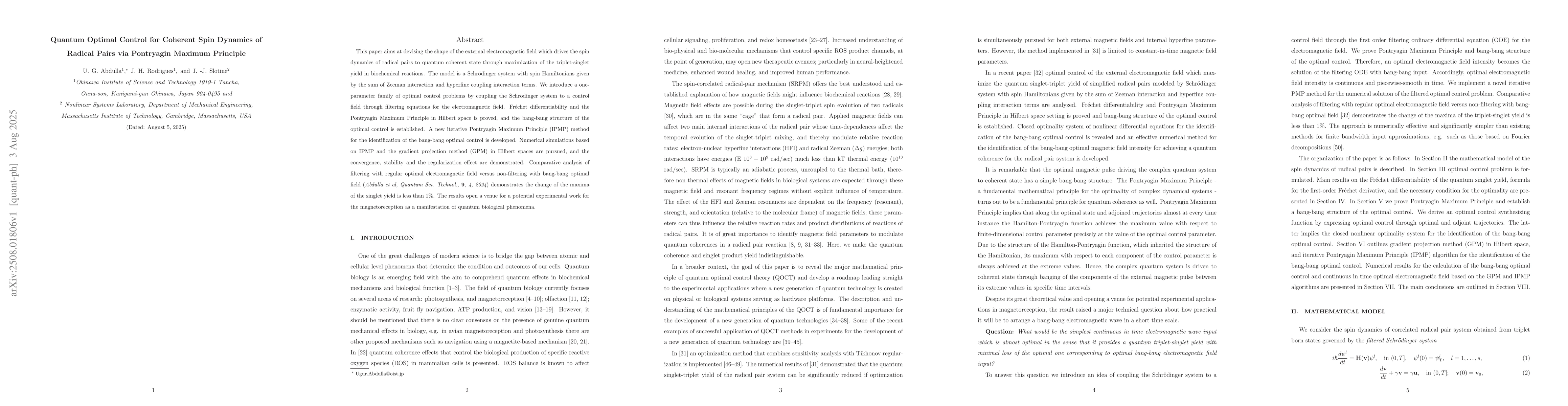 This paper aims at devising the shape of the external electromagnetic field which drives the spin dynamics of radical pairs to quantum coherent state through maximization of the triplet-singlet yield in biochemical reactions. The model is a Schr\"{o}dinger system with spin Hamiltonians given by the sum of Zeeman interaction and hyperfine coupling interaction terms. We introduce a one-parameter family of optimal control problems by coupling the Schr\"{o}dinger system to a control field through filtering equations for the electromagnetic field. Fr\'echet differentiability and the Pontryagin Maximum Principle in Hilbert space is proved, and the bang-bang structure of the optimal control is established. A new iterative Pontryagin Maximum Principle (IPMP) method for the identification of the bang-bang optimal control is developed. Numerical simulations based on IPMP and the gradient projection method (GPM) in Hilbert spaces are pursued, and the convergence, stability and the regularization effect are demonstrated. Comparative analysis of filtering with regular optimal electromagnetic field versus non-filtering with bang-bang optimal field ({\it Abdulla et al, Quantum Sci. Technol., {\bf9}, 4, 2024}) demonstrates the change of the maxima of the singlet yield is less than 1\%. The results open a venue for a potential experimental work for the magnetoreception as a manifestation of quantum biological phenomena.