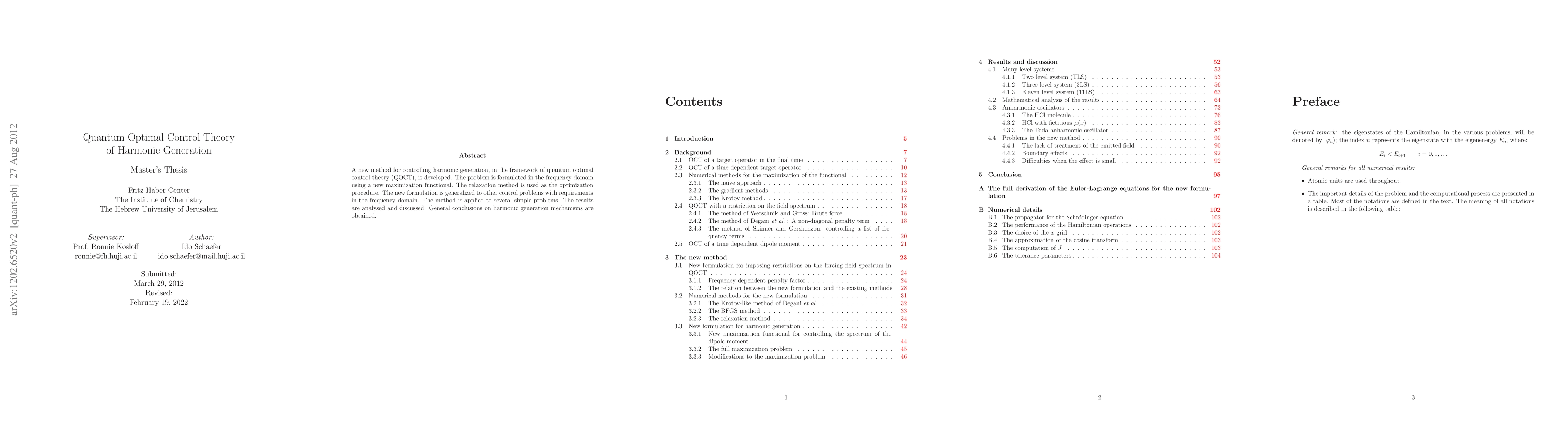 This paper develops a novel quantum optimal control theory method for controlling harmonic generation, utilizing a new maximization functional and the relaxation method. The results provide insights into the mechanisms of harmonic generation and are generalized for other frequency domain control problems.
