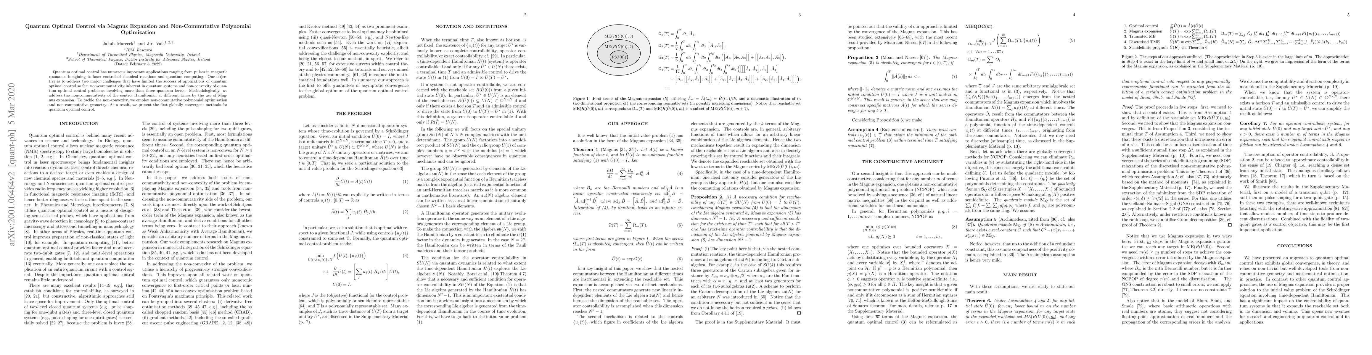 Quantum optimal control has numerous important applications ranging from pulse shaping in magnetic-resonance imagining to laser control of chemical reactions and quantum computing. Our objective is to address two major challenges that have limited the success of applications of quantum optimal control so far: non-commutativity inherent in quantum systems and non-convexity of quantum optimal control problems involving more than three quantum levels. Methodologically, we address the non-commutativity of the control Hamiltonian at different times by the use of Magnus expansion. To tackle the non-convexity, we employ non-commutative polynomial optimisation and non-commutative geometry. As a result, we present the first globally convergent methods for quantum optimal control.