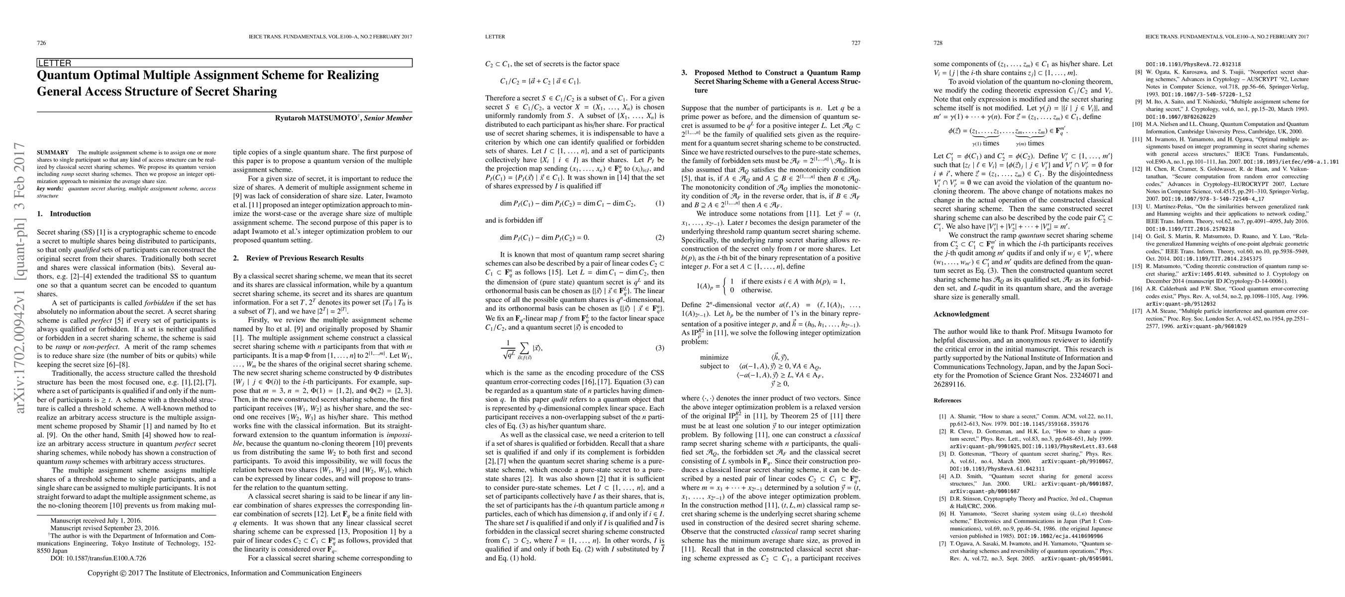 Summary: This paper proposes a quantum version of the multiple assignment scheme for general access structure in secret sharing, incorporating ramp secret sharing schemes, and introduces an integer optimization method to minimize the average share size.