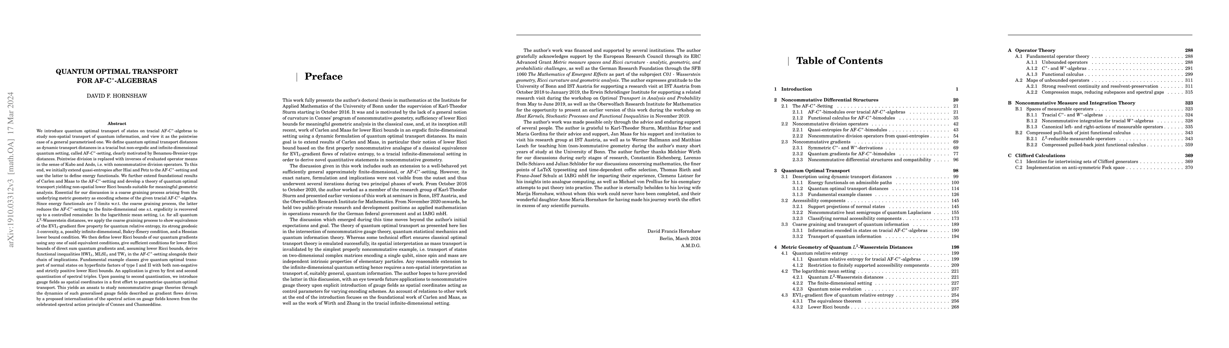 We introduce quantum optimal transport of states on tracial AF-$C^{*}$-algebras to study non-spatial transport of quantum information, and view it as the pointwise case of a general parametrised one. We define quantum optimal transport distances as dynamic transport distances in a tracial but non-ergodic and infinite-dimensional quantum setting, called AF-$C^{*}$-setting. We further extend foundational results of Carlen and Maas to the AF-$C^{*}$-setting and develop a theory of quantum optimal transport yielding non-spatial lower Ricci bounds suitable for meaningful geometric analysis. Essential for our discussion is a coarse graining process arising from the underlying metric geometry as encoding scheme of the given tracial AF-$C^{*}$-algebra. In the logarithmic mean setting, we apply the coarse graining process to show equivalence of the EVI$_{\lambda}$-gradient flow property for quantum relative entropy, its strong geodesic $\lambda$-convexity, a, possibly infinite-dimensional, Bakry-\'Emery condition, and a Hessian lower bound condition. We then define lower Ricci bounds of our quantum gradients using any one of said equivalent conditions, give sufficient conditions for lower Ricci bounds of direct sum quantum gradients and, assuming lower Ricci bounds, derive functional inequalities HWI$_{\lambda}$, MLSI$_{\lambda}$ and TW$_{\lambda}$ in the AF-$C^{*}$-setting alongside their chain of implications. Fundamental example classes give quantum optimal transport of normal states on hyperfinite factors of type I and II with both non-negative and strictly positive lower Ricci bounds. An application is given by first and second quantisation of spectral triples.